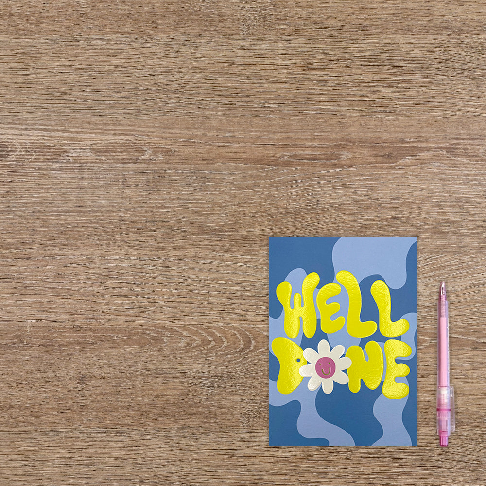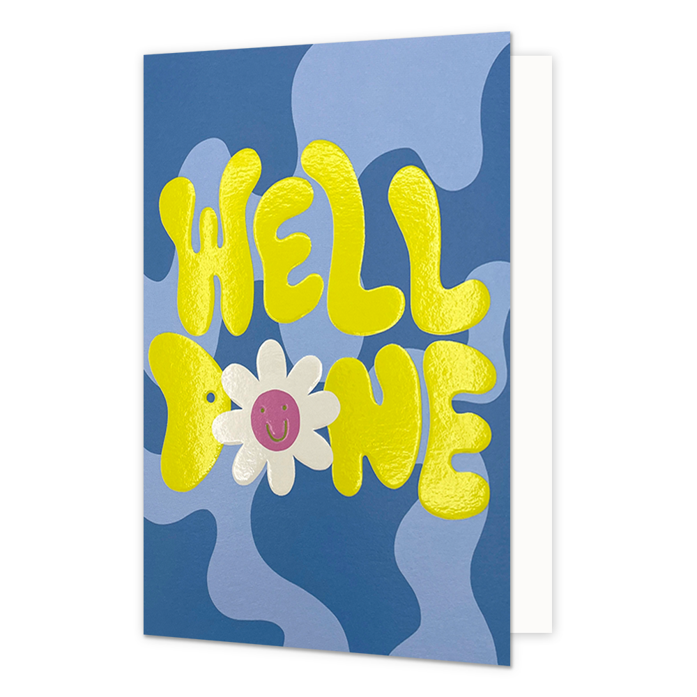 De wenskaart heeft een afmeting van x en een staande vorm. Op deze wenskaart staat de tekst: "Well done" op een paarse achtergrond. De binnenzijde van de wenskaart is blanco wat voldoende ruimte geeft om een persoonlijke boodschap te schrijven .
