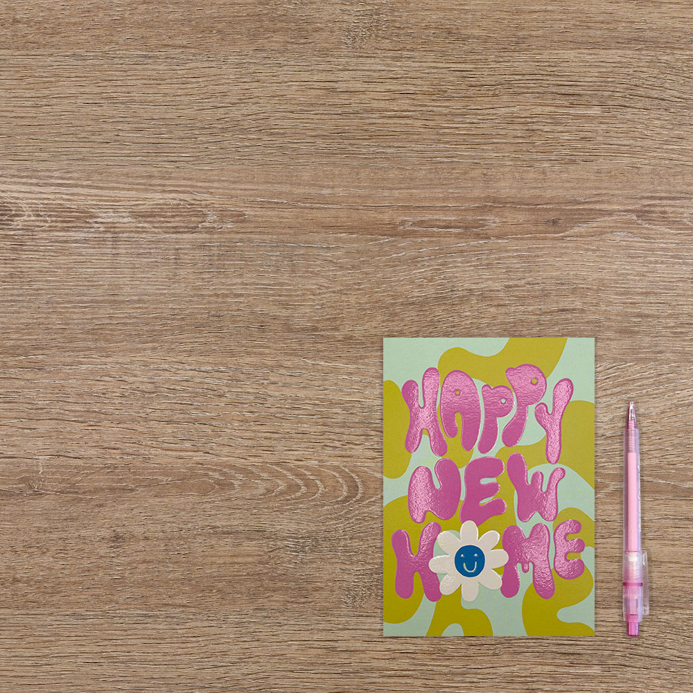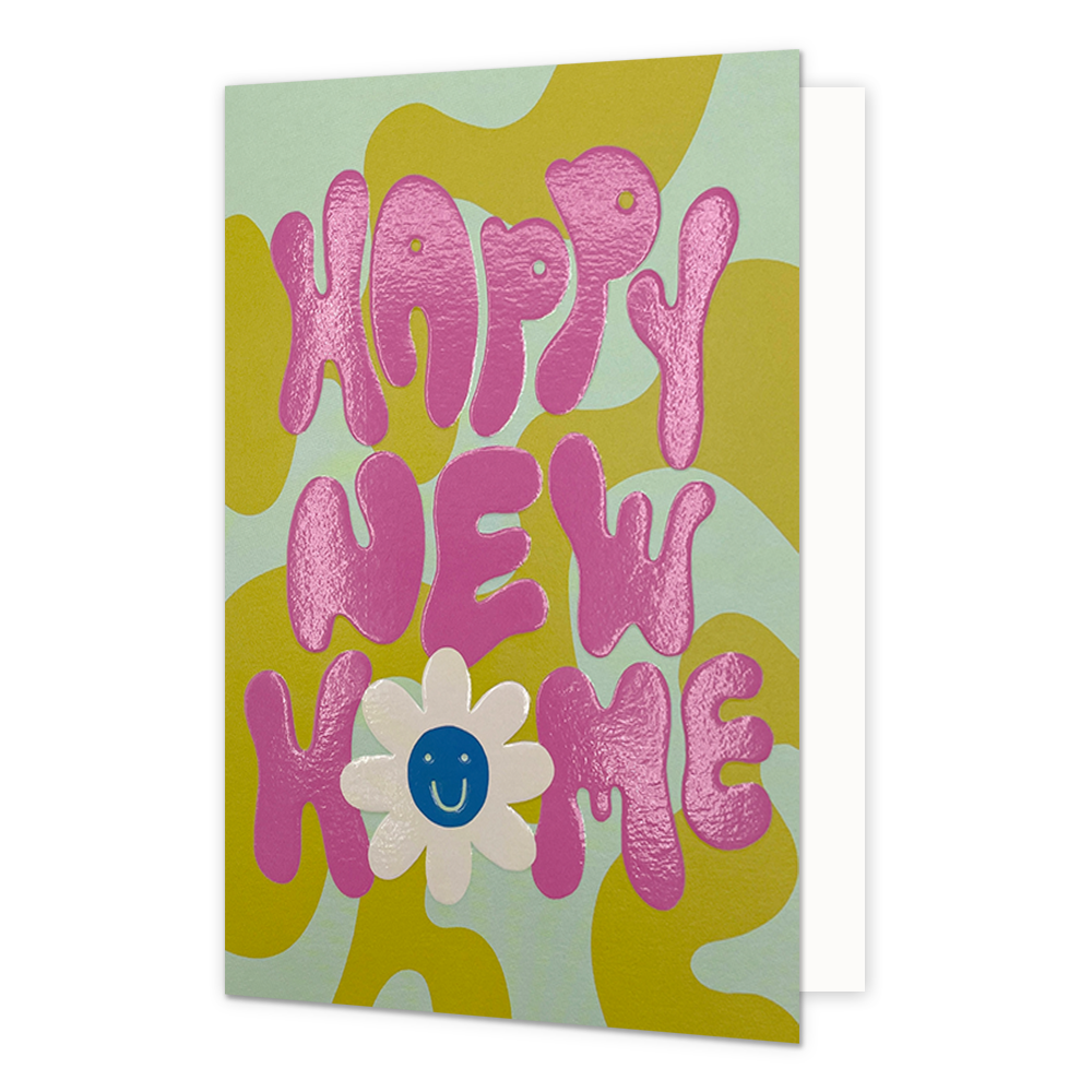 De wenskaart heeft een afmeting van x en een staande vorm. Op deze wenskaart staat de tekst: "Happy new home" op een donkergele achtergrond. De binnenzijde van de wenskaart is blanco wat voldoende ruimte geeft om een persoonlijke boodschap te schrijven .