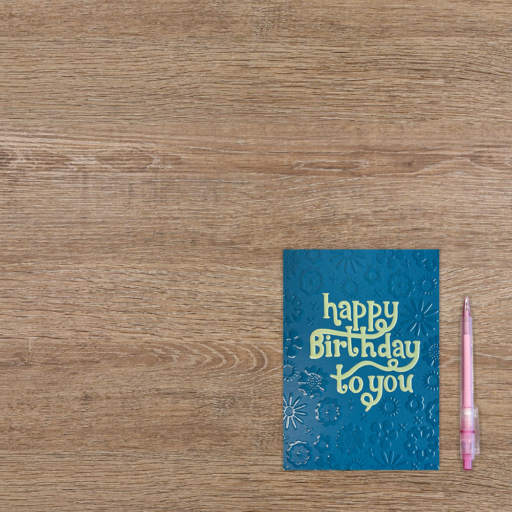 De wenskaart heeft een afmeting van x en een staande vorm. Op deze wenskaart staat de tekst: "Happy birthday to you". De binnenzijde van de wenskaart is blanco wat voldoende ruimte geeft om een persoonlijke boodschap te schrijven .