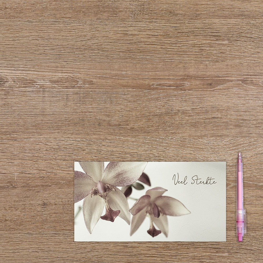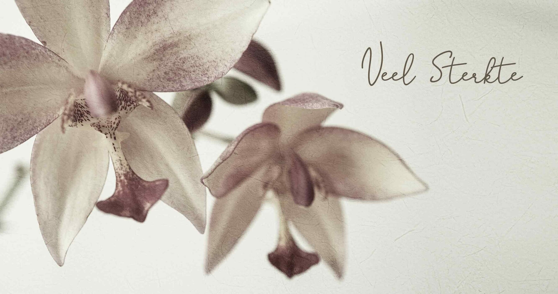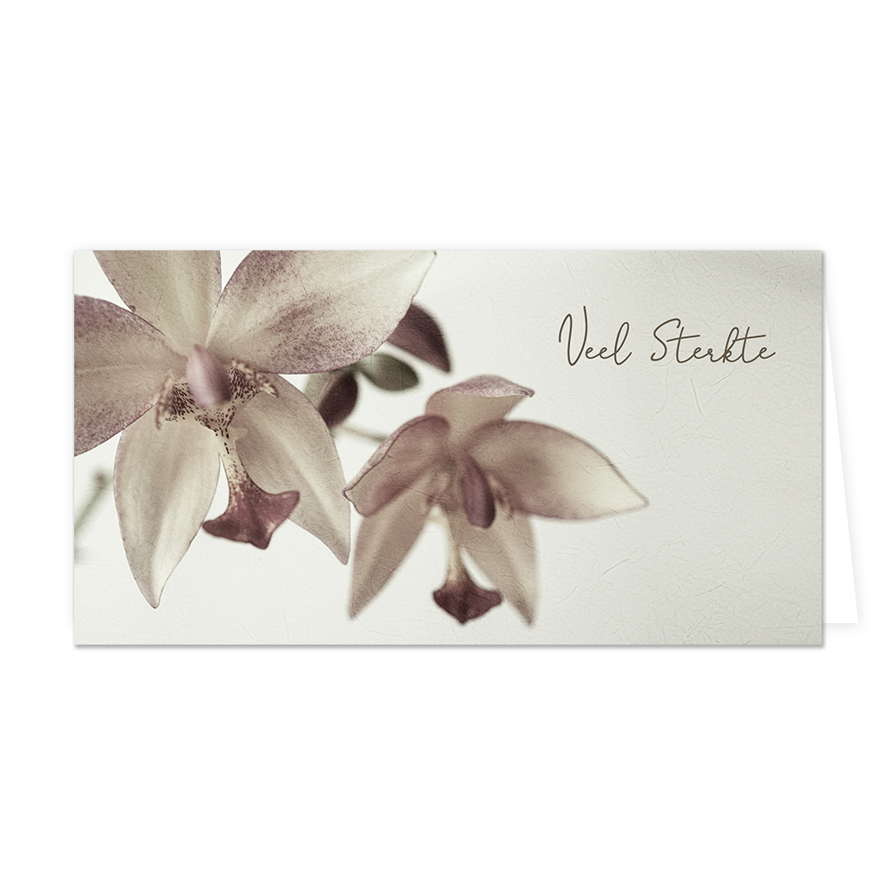 De wenskaart heeft een afmeting van x en een liggende vorm. Op deze wenskaart staat twee grijze bloemen met daarnaast de tekst: "Veel sterkte". De binnenzijde van de wenskaart is blanco wat voldoende ruimte geeft om een persoonlijke boodschap te schrijven .