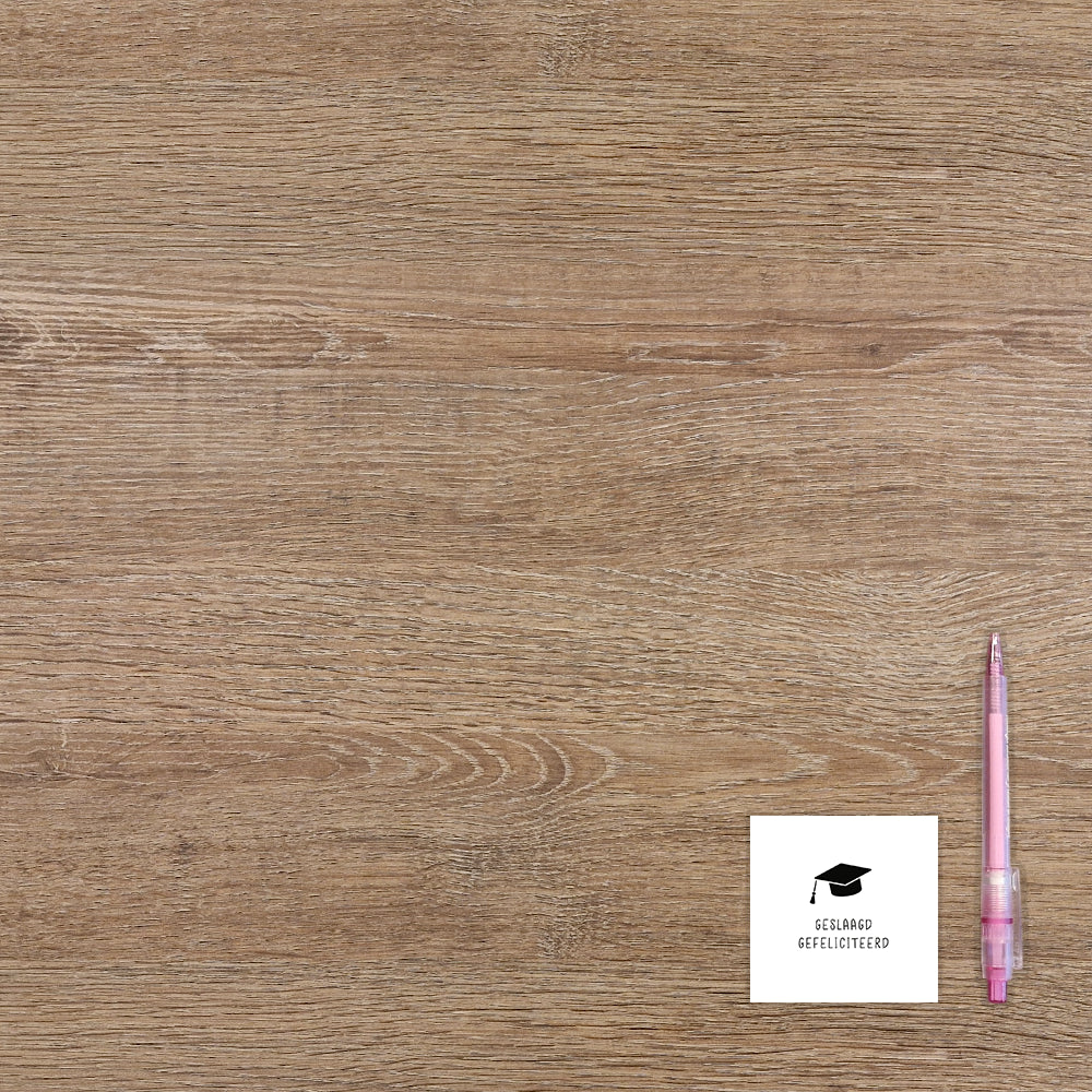 De wenskaart heeft een afmeting van x en een vierkante vorm. Op deze wenskaart staat een afstudeerhoed met daaronder de tekst: "Geslaagd gefeliciteerd". De binnenzijde van de wenskaart is blanco wat voldoende ruimte geeft om een persoonlijke boodschap te schrijven .