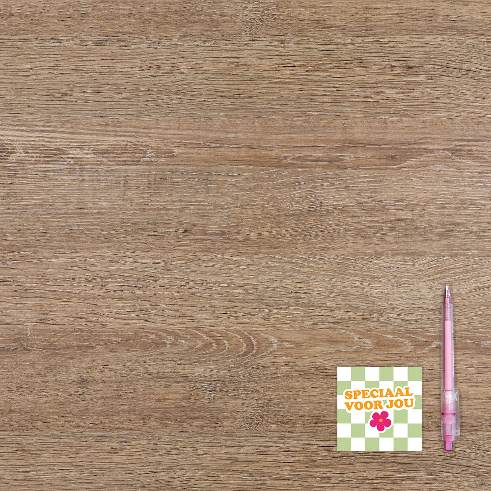 De wenskaart heeft een afmeting van x en een vierkante vorm. Op deze wenskaart staan witte en groene vierkantjes met een roze bloem en de tekst: "Speciaal voor jou". De binnenzijde van de wenskaart is blanco wat voldoende ruimte geeft om een persoonlijke boodschap te schrijven .
