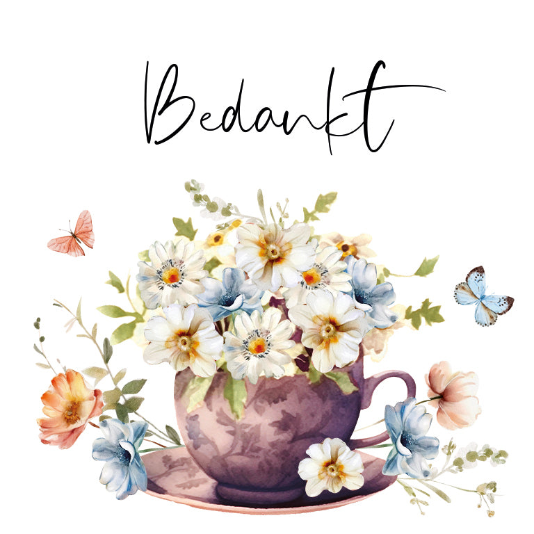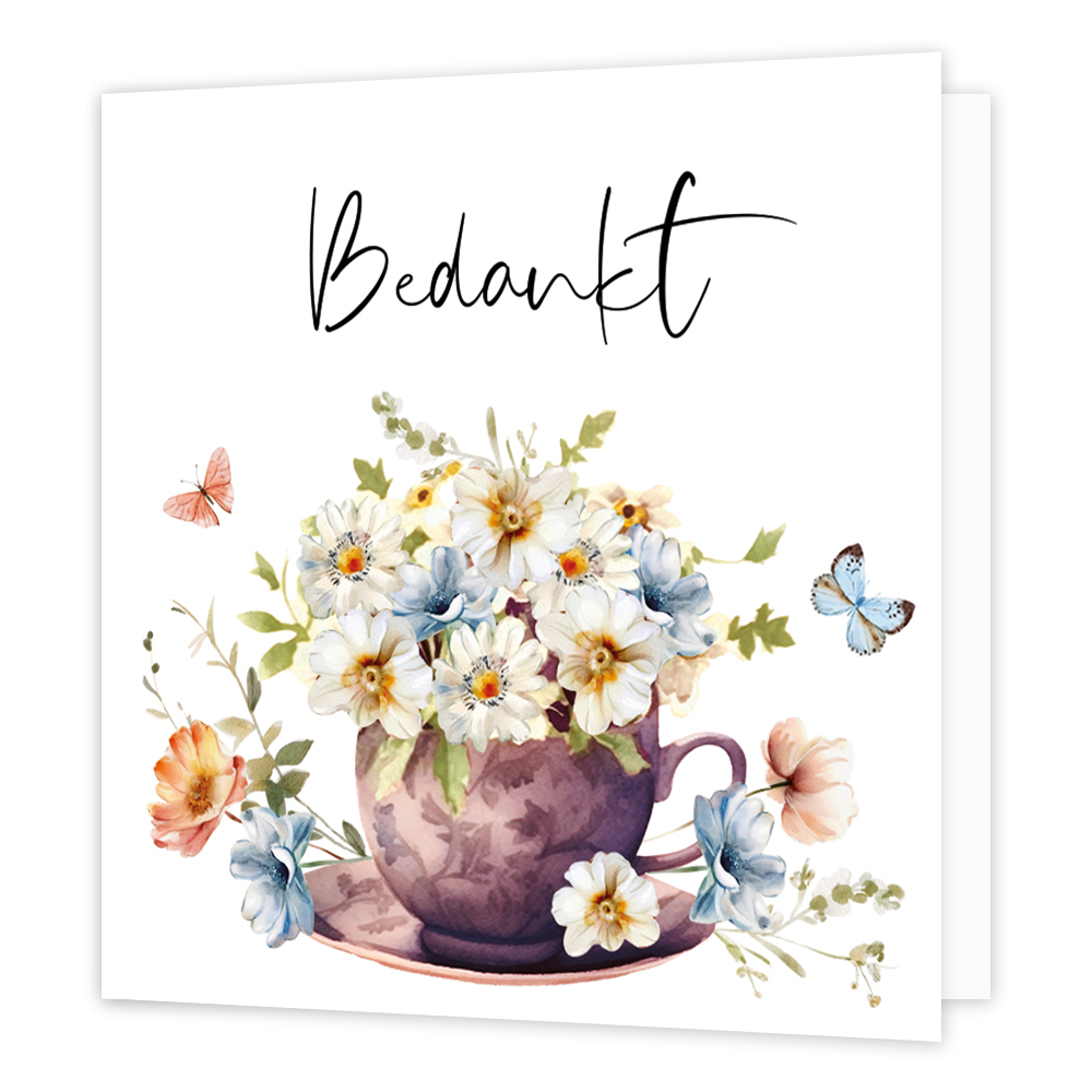 De wenskaart heeft een afmeting van x en een vierkante vorm. Op deze wenskaart staat een kopje met bloemen erin en daarboven de tekst: "Bedankt". De binnenzijde van de wenskaart is blanco wat voldoende ruimte geeft om een persoonlijke boodschap te schrijven .