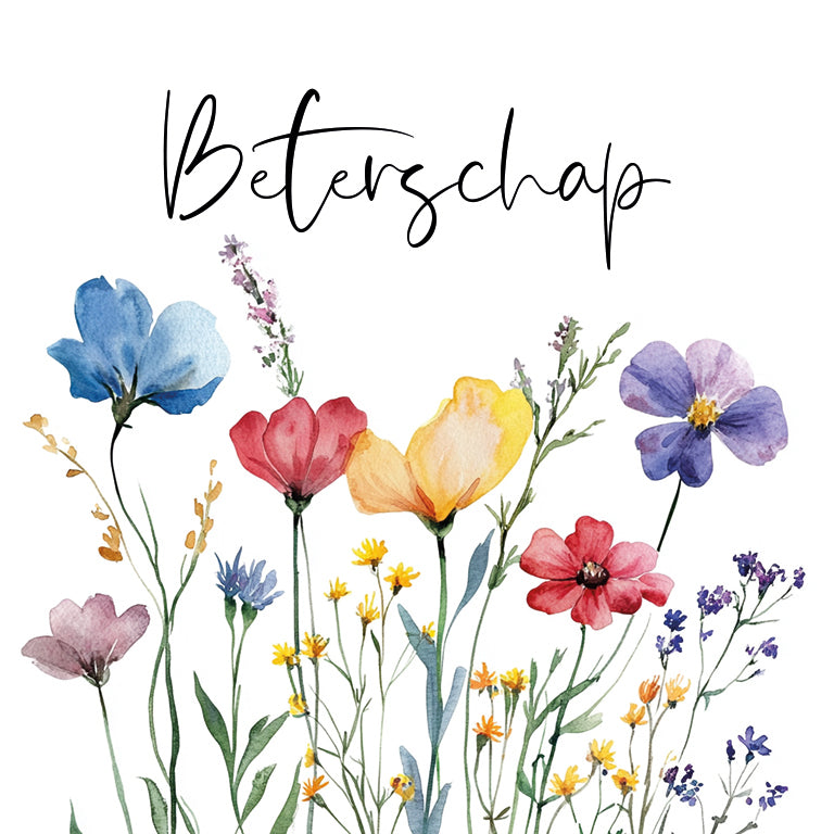 De wenskaart heeft een afmeting van x en een vierkante vorm. Op deze wenskaart staan bloemen met daarboven de tekst: "Beterschap". De binnenzijde van de wenskaart is blanco wat voldoende ruimte geeft om een persoonlijke boodschap te schrijven .