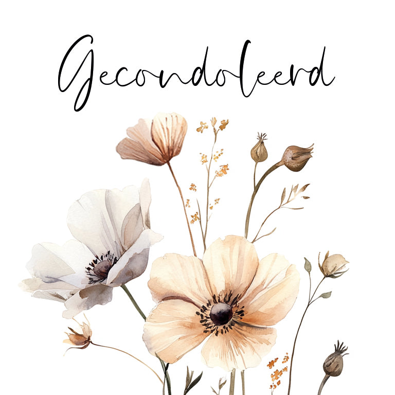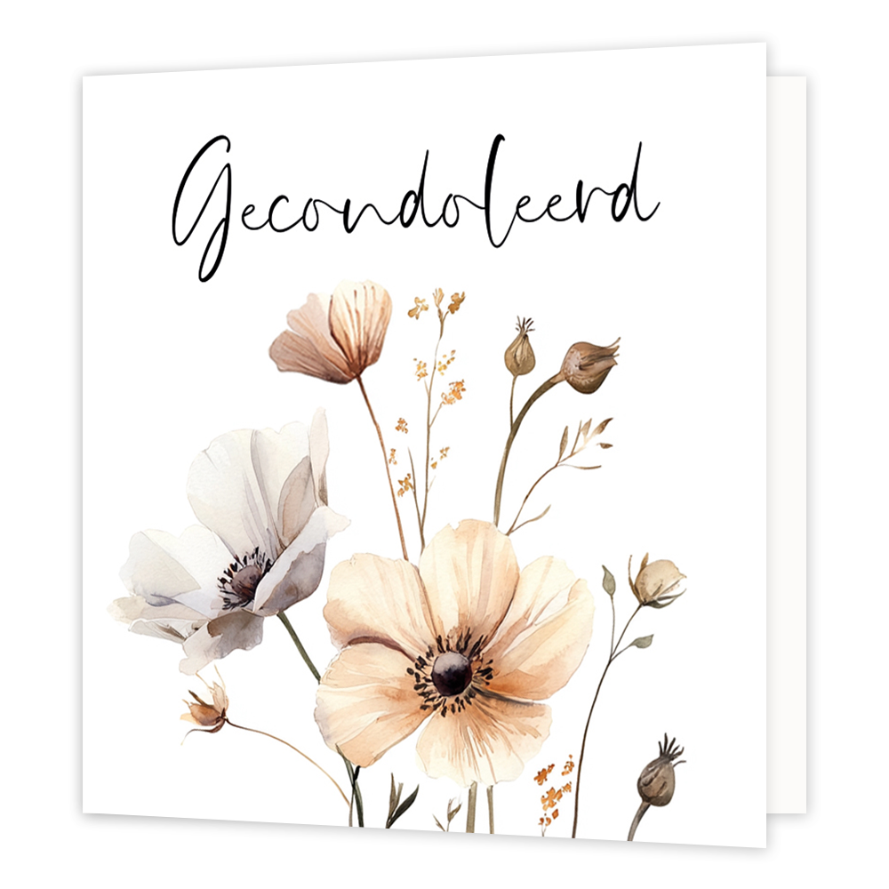 De wenskaart heeft een afmeting van x en een vierkante vorm. Op deze wenskaart staan bloemen in de kleuren grijs en beige met daarboven de tekst: "Gecondoleerd". De binnenzijde van de wenskaart is blanco wat voldoende ruimte geeft om een persoonlijke boodschap te schrijven .
