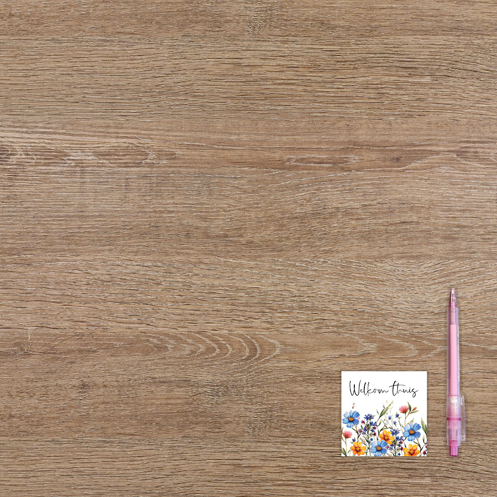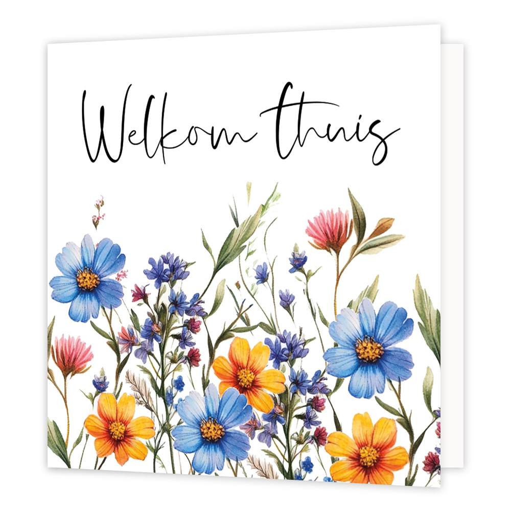 De wenskaart heeft een afmeting van x en een vierkante vorm. Op deze wenskaart staan bloemen in diverse kleuren met daarboven de tekst: "Welkom thuis". De binnenzijde van de wenskaart is blanco wat voldoende ruimte geeft om een persoonlijke boodschap te schrijven .