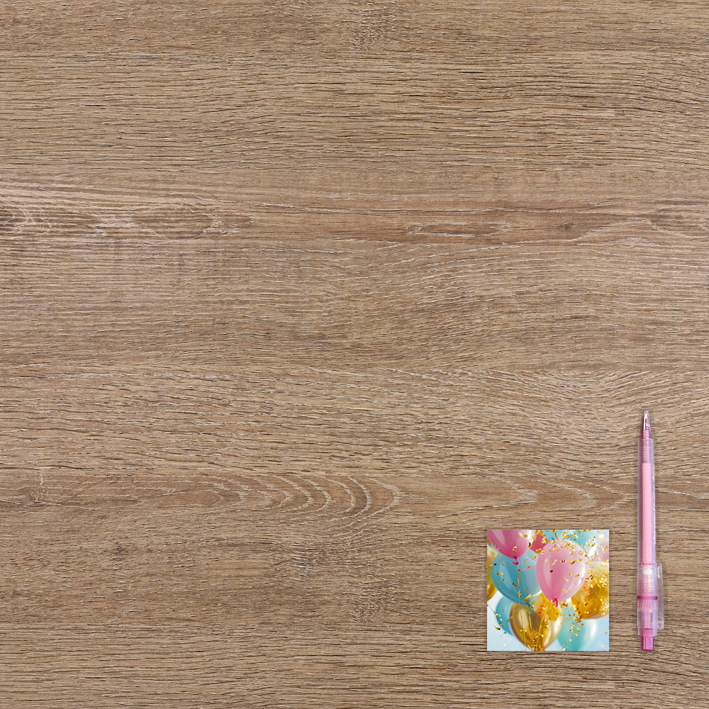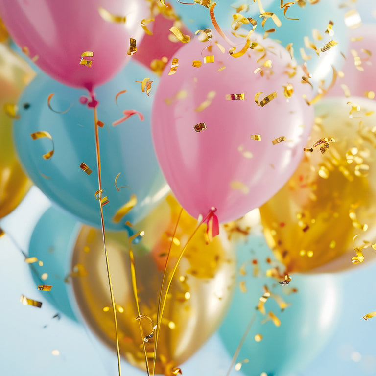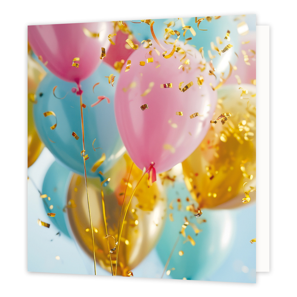 De wenskaart heeft een afmeting van x en een vierkante vorm. Op deze wenskaart staan ballonnen in de kleuren roze, blauw en goud. De binnenzijde van de wenskaart is blanco wat voldoende ruimte geeft om een persoonlijke boodschap te schrijven .