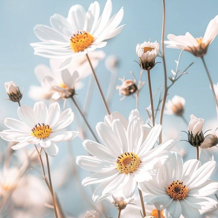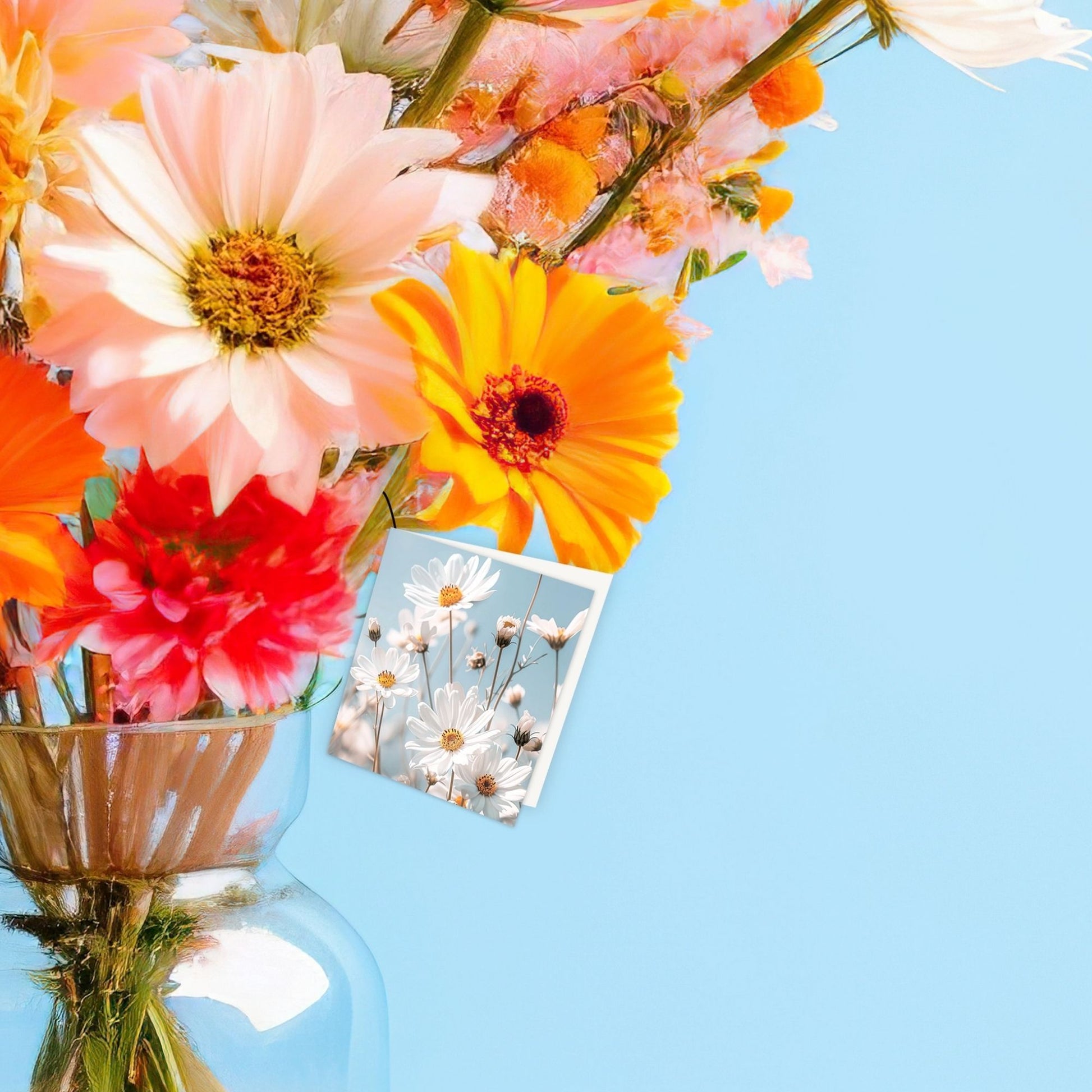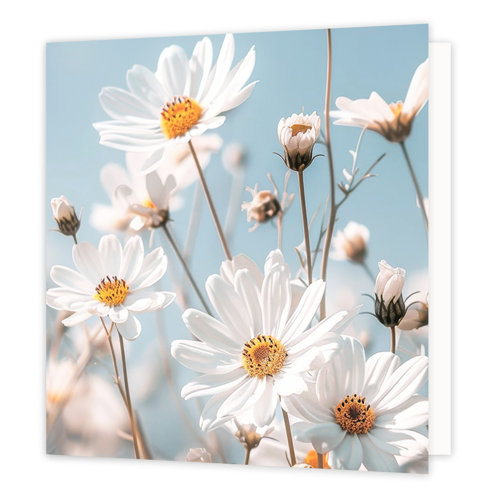 De wenskaart heeft een afmeting van x en een vierkante vorm. Op deze wenskaart staan madeliefjes. De binnenzijde van de wenskaart is blanco wat voldoende ruimte geeft om een persoonlijke boodschap te schrijven .