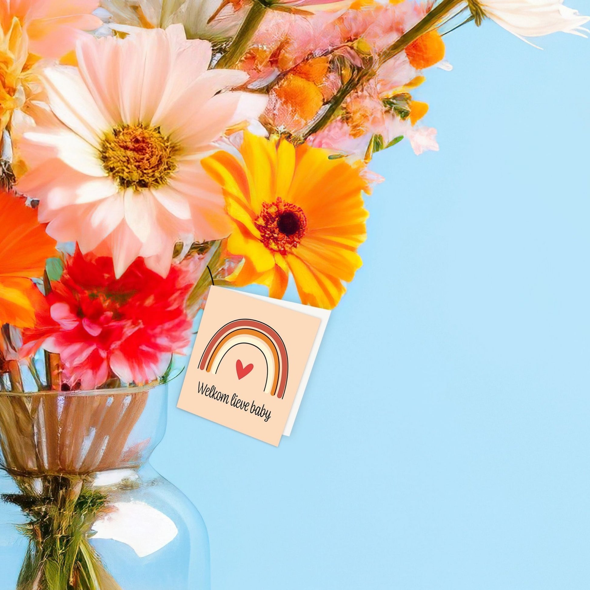 De wenskaart heeft een afmeting van x en een vierkante vorm. Op deze wenskaart staat een regenboog met een rood hartje en daaronder de tekst: "Welkom lieve baby". De binnenzijde van de wenskaart is blanco wat voldoende ruimte geeft om een persoonlijke boodschap te schrijven .