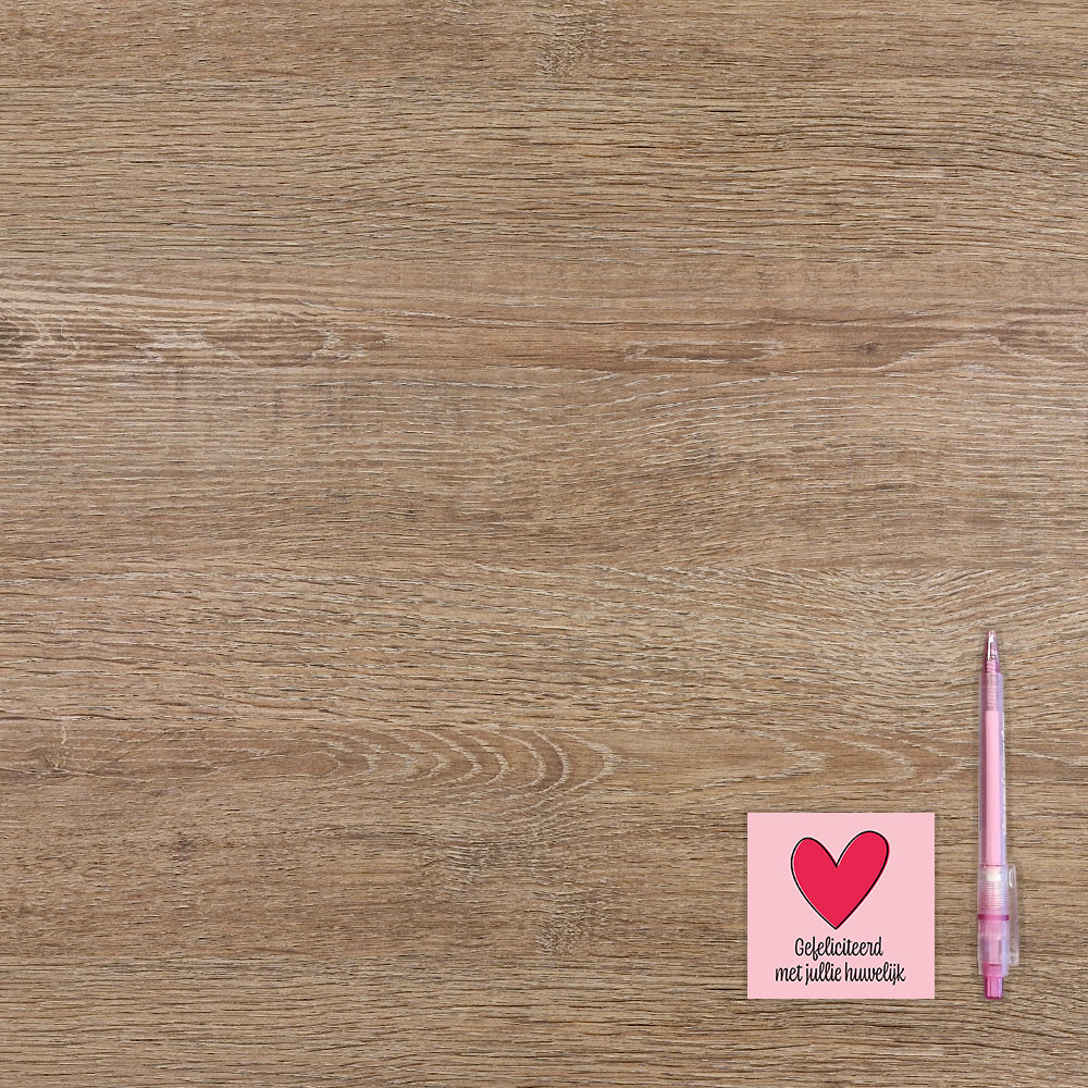 De wenskaart heeft een afmeting van x en een vierkante vorm. Op deze wenskaart staat een roze hartje met daaronder de tekst: "Gefeliciteerd met jullie huwelijk". De binnenzijde van de wenskaart is blanco wat voldoende ruimte geeft om een persoonlijke boodschap te schrijven .