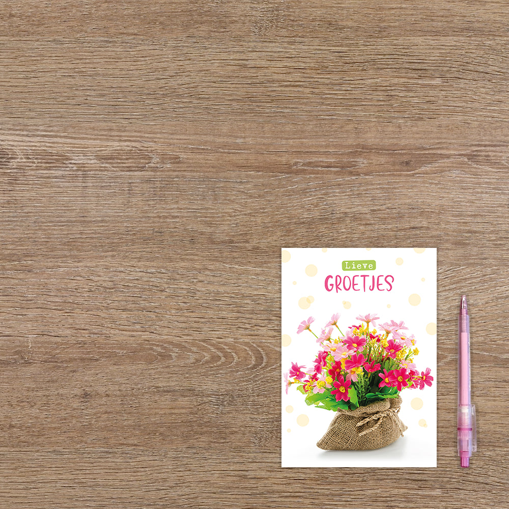 De wenskaart heeft een afmeting van x en een staande vorm. Op deze wenskaart staan bloemen in de kleuren roze en geel met daarboven de tekst: "Lieve groetjes". De binnenzijde van de wenskaart is blanco wat voldoende ruimte geeft om een persoonlijke boodschap te schrijven .