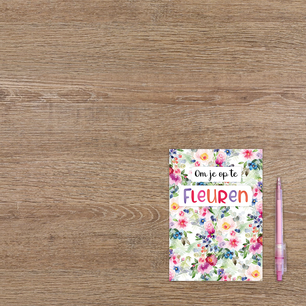 De wenskaart heeft een afmeting van x en een staande vorm. Op deze wenskaart staan bloemen in de kleuren roze, paars, blauw, groen, geel en rood. In het midden staat de tekst: "Om je op te fleuren". De binnenzijde van de wenskaart is blanco wat voldoende ruimte geeft om een persoonlijke boodschap te schrijven .