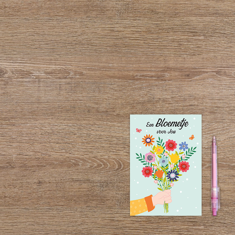 De wenskaart heeft een afmeting van x en een staande vorm. Op deze wenskaart staat een hand die een boeket met bloemen vasthoudt. Daarboven staat de tekst: "Een bloemetje voor jou". De binnenzijde van de wenskaart is blanco wat voldoende ruimte geeft om een persoonlijke boodschap te schrijven .