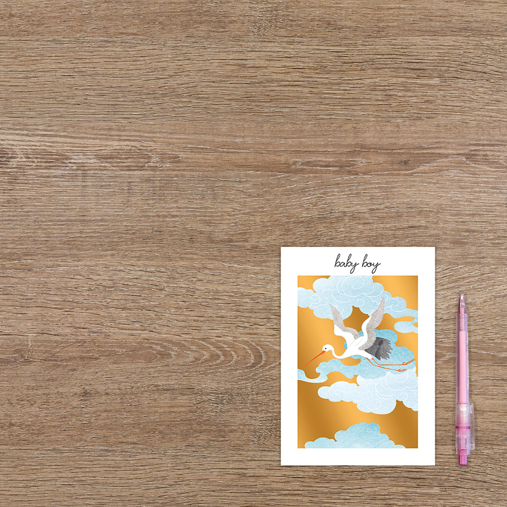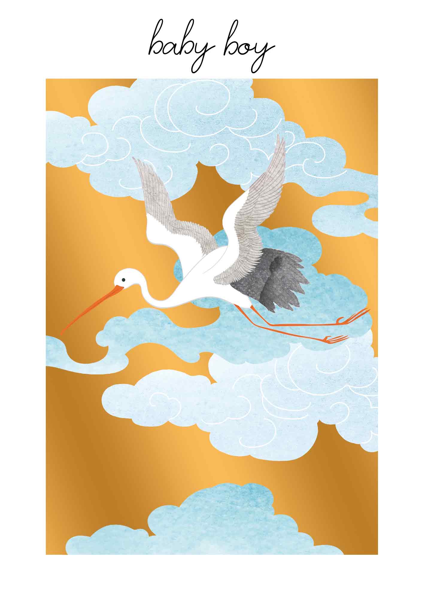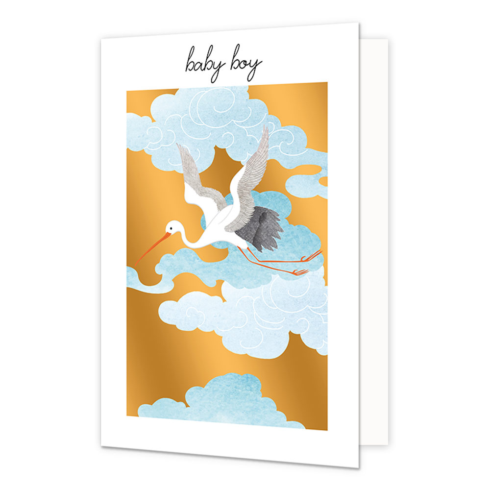 De wenskaart heeft een afmeting van x en een staande vorm. Op deze wenskaart staat een ooievaar die door blauwe wolken vliegt, met een gouden achtergrond. Boven de illustratie staat de tekst: "Baby boy". De binnenzijde van de wenskaart is blanco wat voldoende ruimte geeft om een persoonlijke boodschap te schrijven .