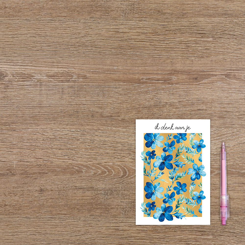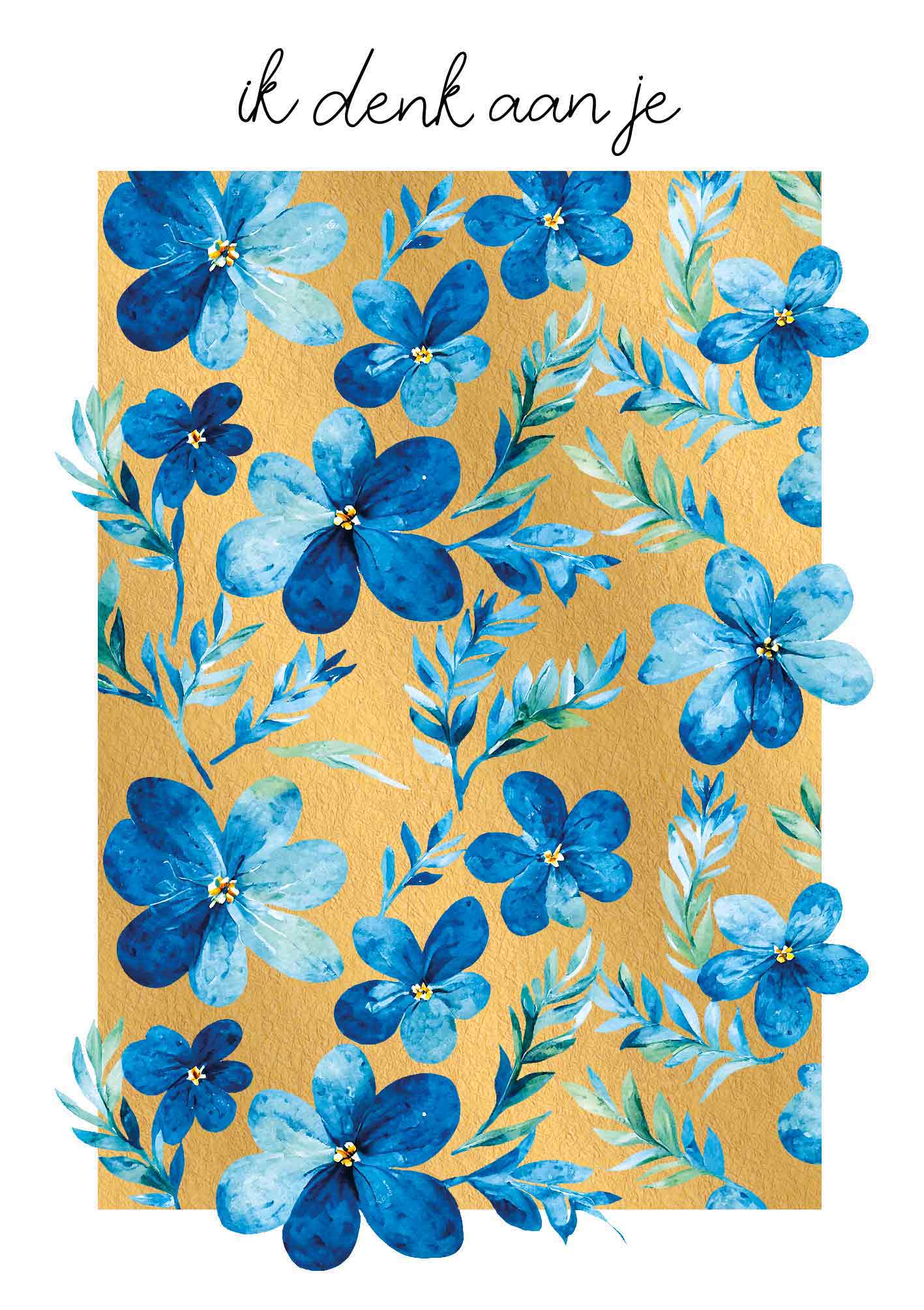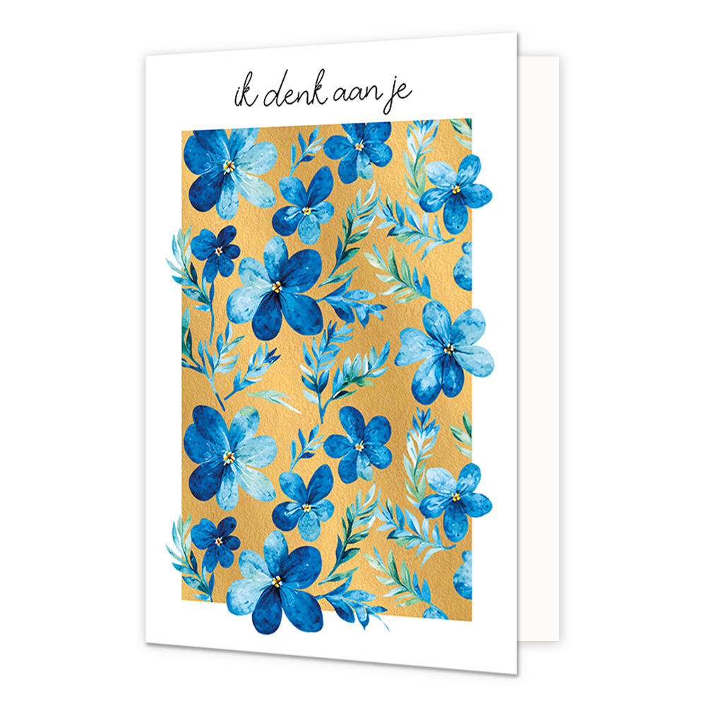 De wenskaart heeft een afmeting van x en een staande vorm. Op deze wenskaart staan blauwe bloemen en takjes, op een gouden achtergrond. Boven de illustratie staat de tekst: "Ik denk aan je". De binnenzijde van de wenskaart is blanco wat voldoende ruimte geeft om een persoonlijke boodschap te schrijven .
