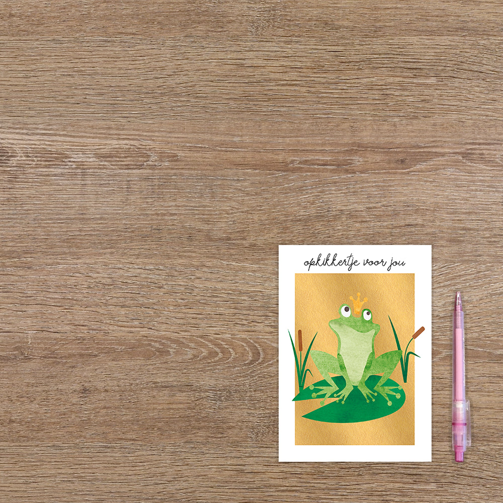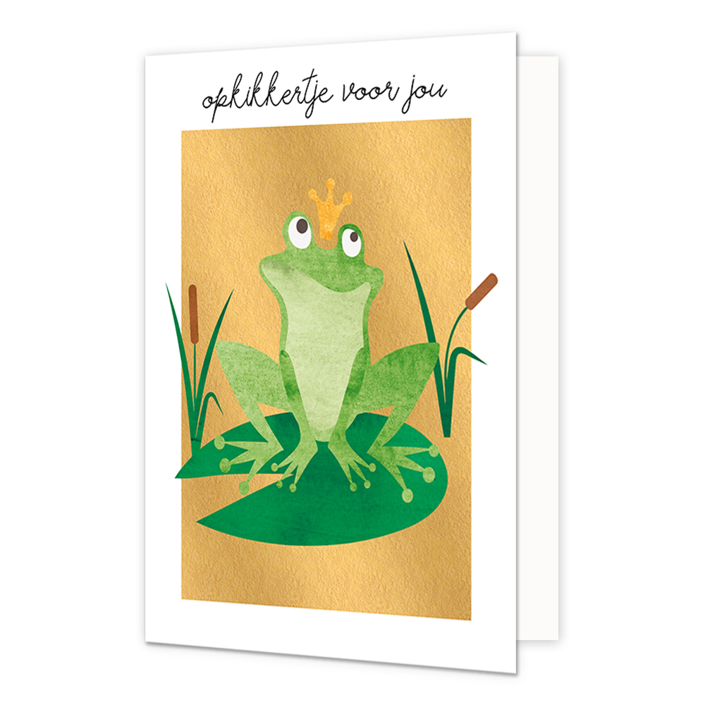 De wenskaart heeft een afmeting van x en een staande vorm. Op deze wenskaart staan een kikker met een gouden kroon, op een gouden achtergrond. Boven de illustratie staat de tekst: "Opkikkertje voor jou". De binnenzijde van de wenskaart is blanco wat voldoende ruimte geeft om een persoonlijke boodschap te schrijven .
