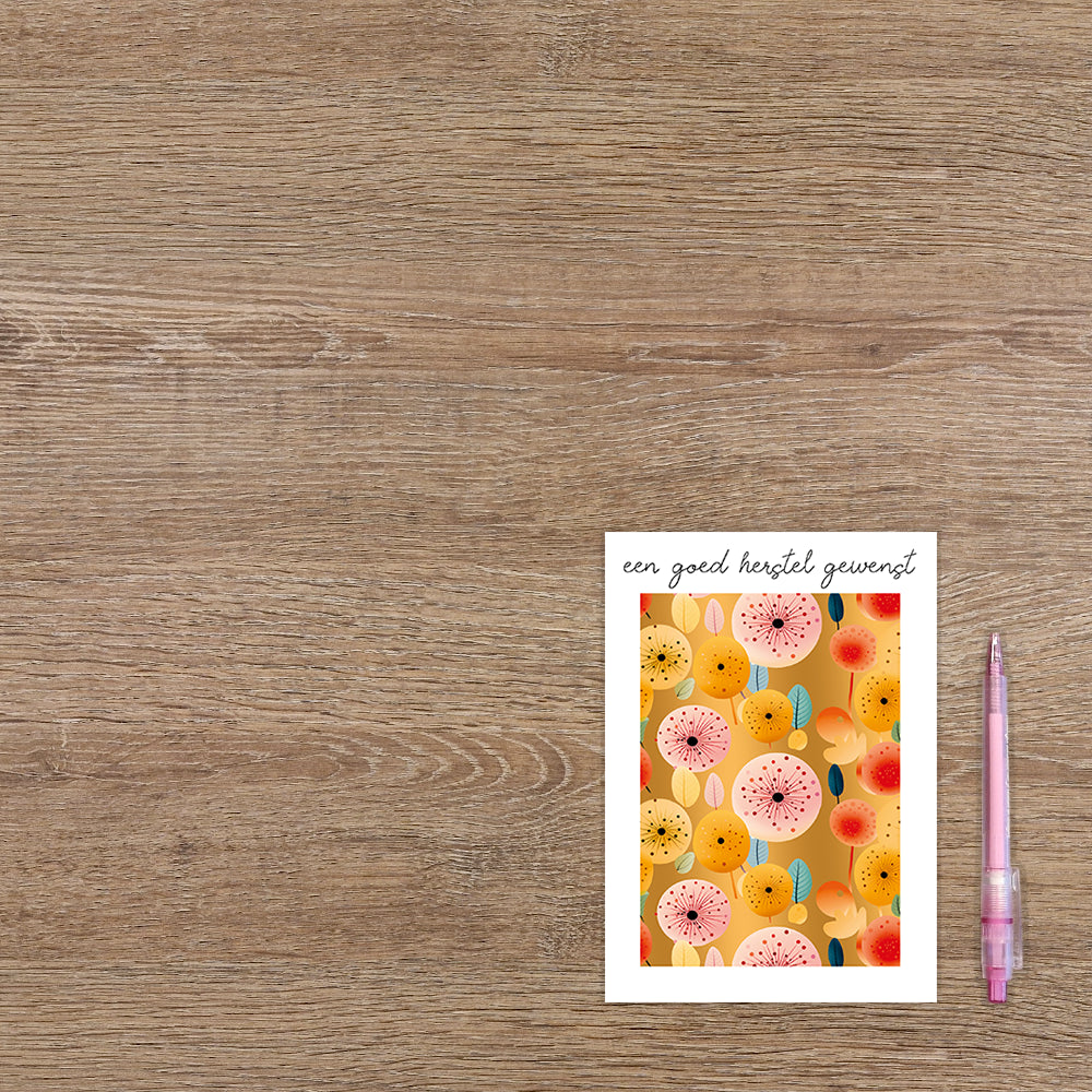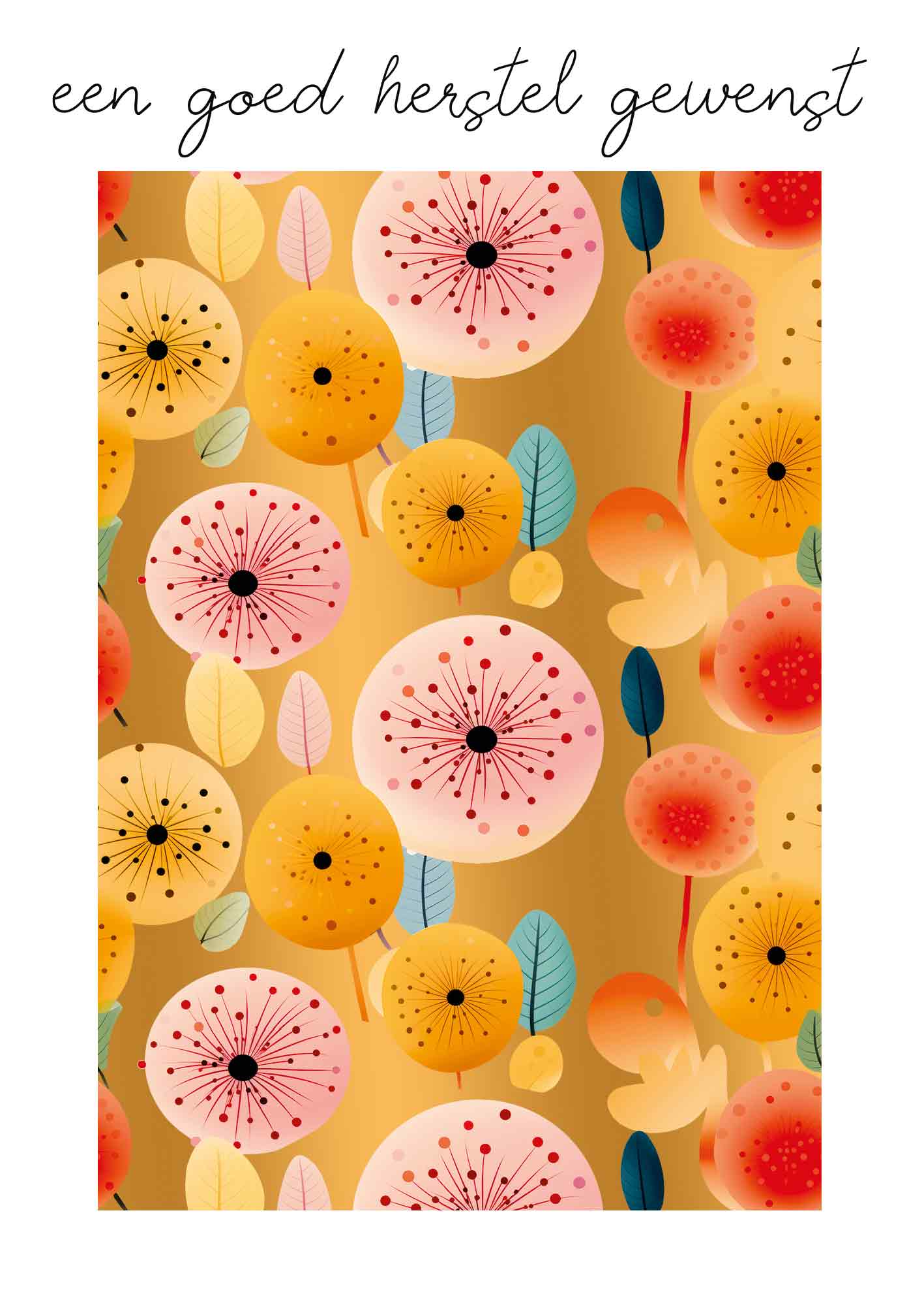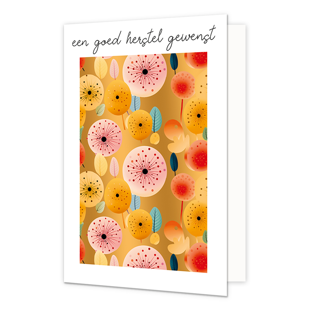 De wenskaart heeft een afmeting van x en een staande vorm. Op deze wenskaart staan grondvormige bloemen en blaadjes in de kleuren roze, geel, blauw, rood, oranje en groen, op een gouden achtergrond. Boven de illustratie staat de tekst: "Een goed herstel gewenst". De binnenzijde van de wenskaart is blanco wat voldoende ruimte geeft om een persoonlijke boodschap te schrijven .