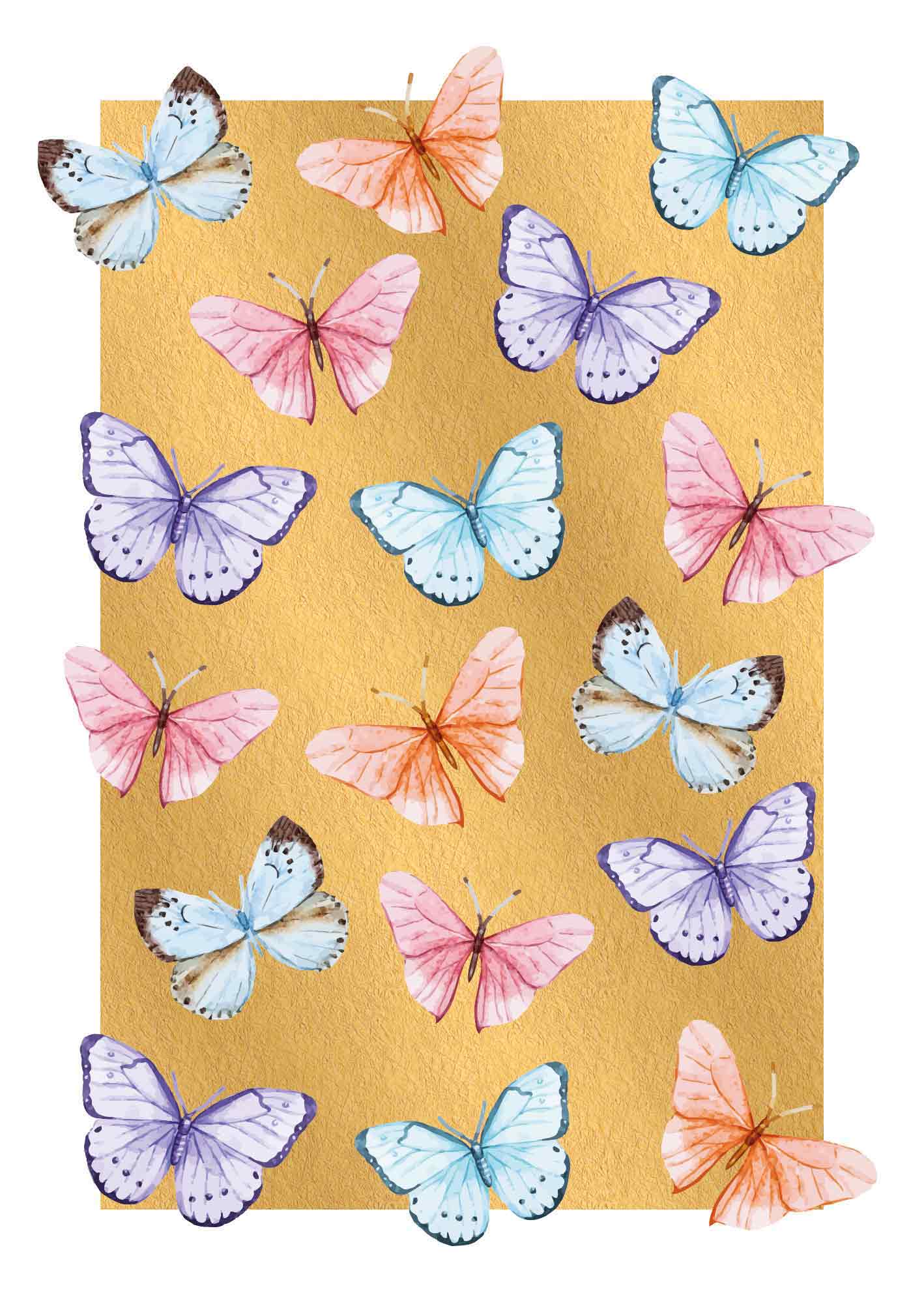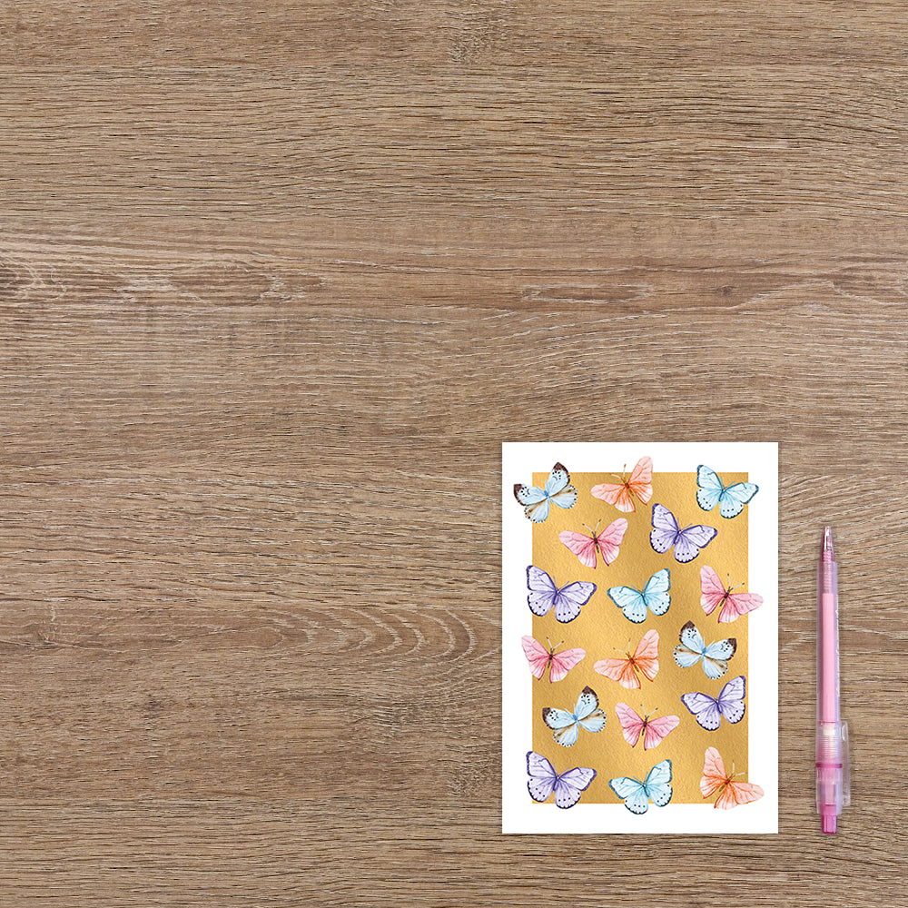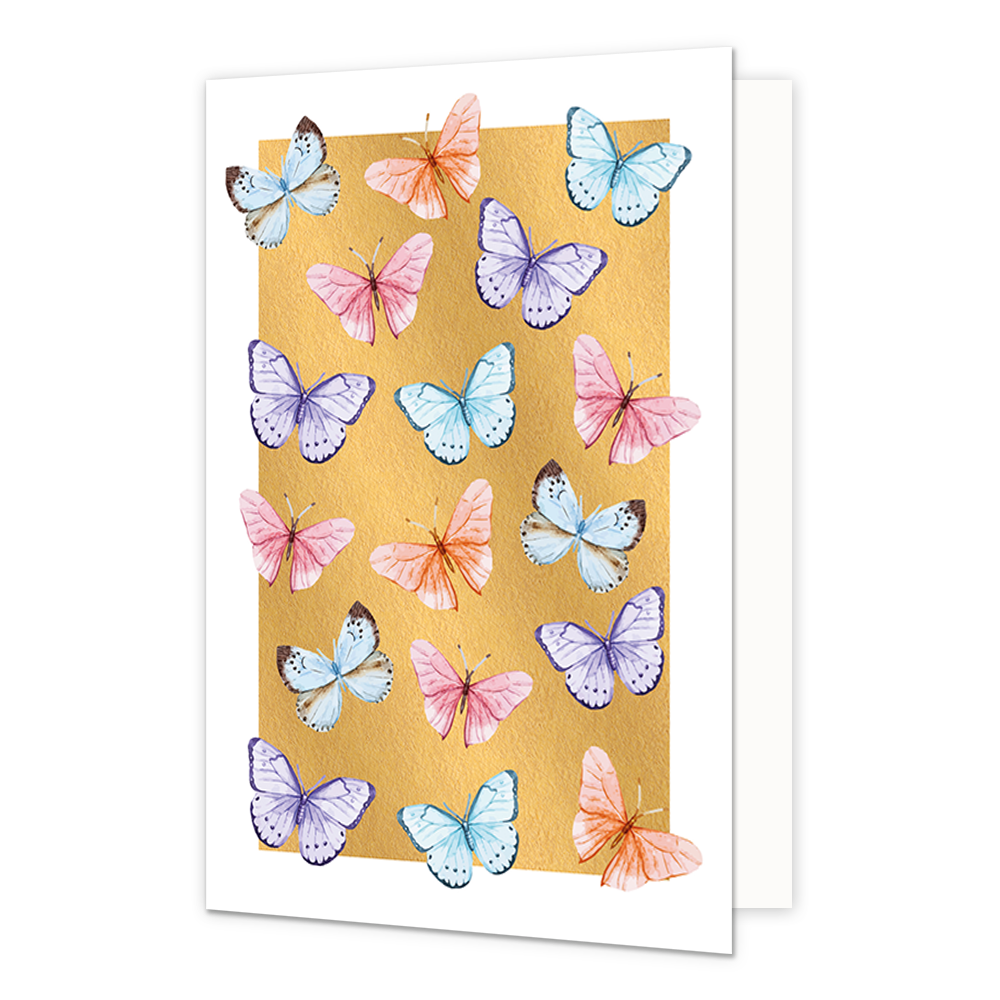 De wenskaart heeft een afmeting van x en een staande vorm. Op deze wenskaart staan vlinders in de kleuren blauw, paars, roze en oranje, op een gouden achtergrond. De binnenzijde van de wenskaart is blanco wat voldoende ruimte geeft om een persoonlijke boodschap te schrijven .