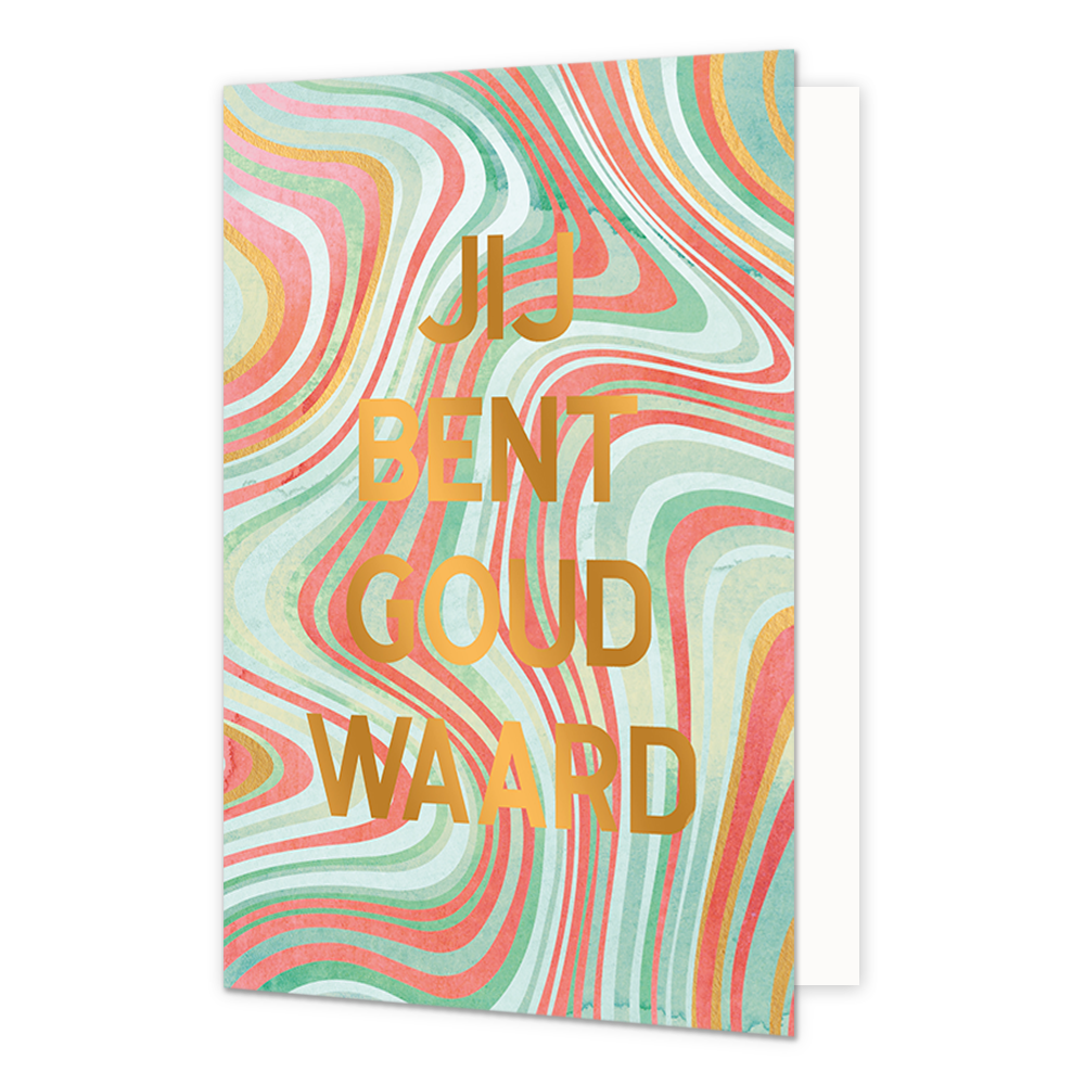 De wenskaart heeft een afmeting van x en een staande vorm. Op deze wenskaart staan kronkelende lijnen in de kleuren roze, blauw, mintgroen en goud. In het midden staat de gouden tekst: "Jij bet goud waard". De binnenzijde van de wenskaart is blanco wat voldoende ruimte geeft om een persoonlijke boodschap te schrijven .