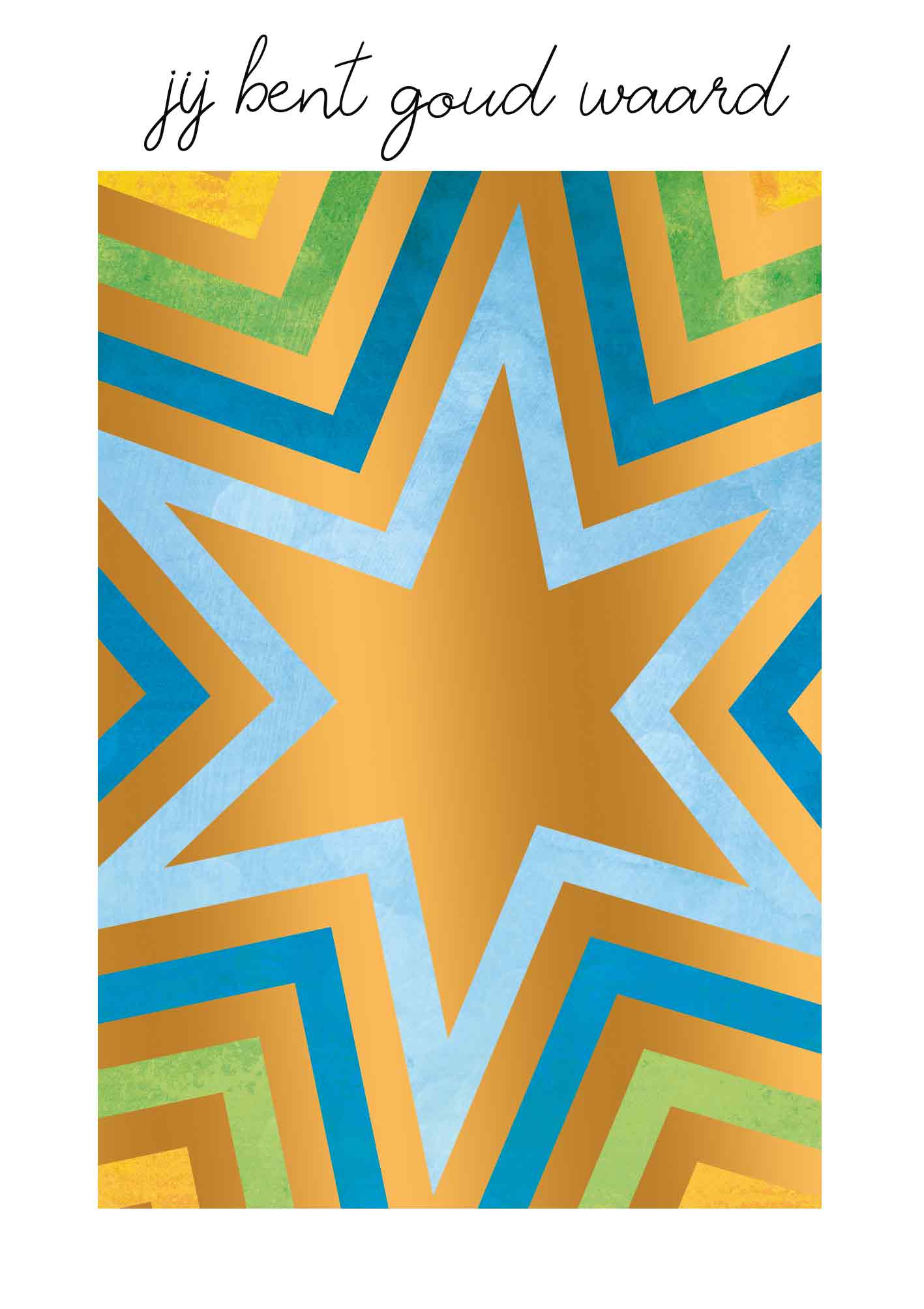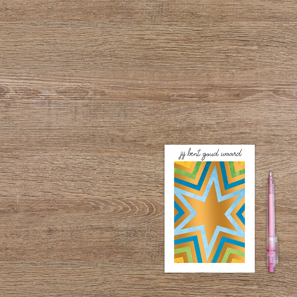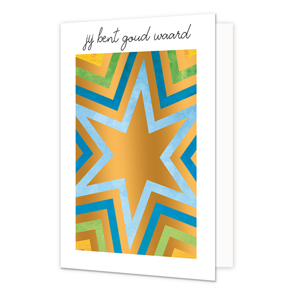 De wenskaart heeft een afmeting van x en een staande vorm. Op deze wenskaart staan sterren in de kleuren blauw, groen, geel en goud. Boven de illustratie staat de tekst: "Jij bent goud waard". De binnenzijde van de wenskaart is blanco wat voldoende ruimte geeft om een persoonlijke boodschap te schrijven .