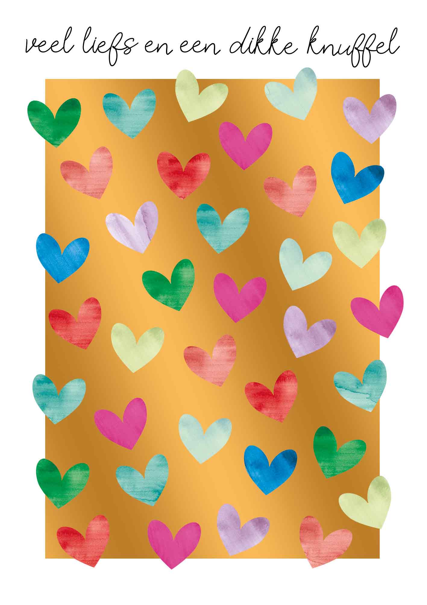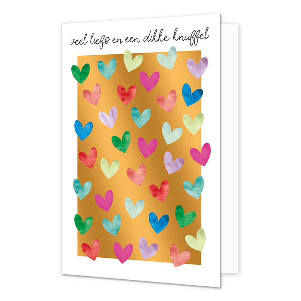 De wenskaart heeft een afmeting van x en een staande vorm. Op deze wenskaart staan hartjes in de kleuren rood, paars, blauw, rood en blauw, op een gouden achtergrond. Boven de illustratie staat de tekst: "Veel liefs en een dikke knuffel". De binnenzijde van de wenskaart is blanco wat voldoende ruimte geeft om een persoonlijke boodschap te schrijven .