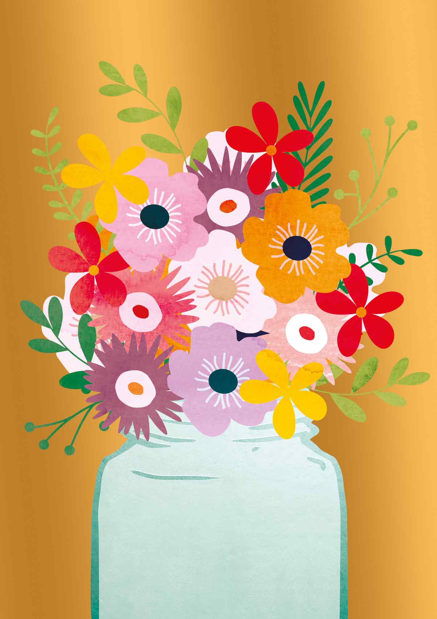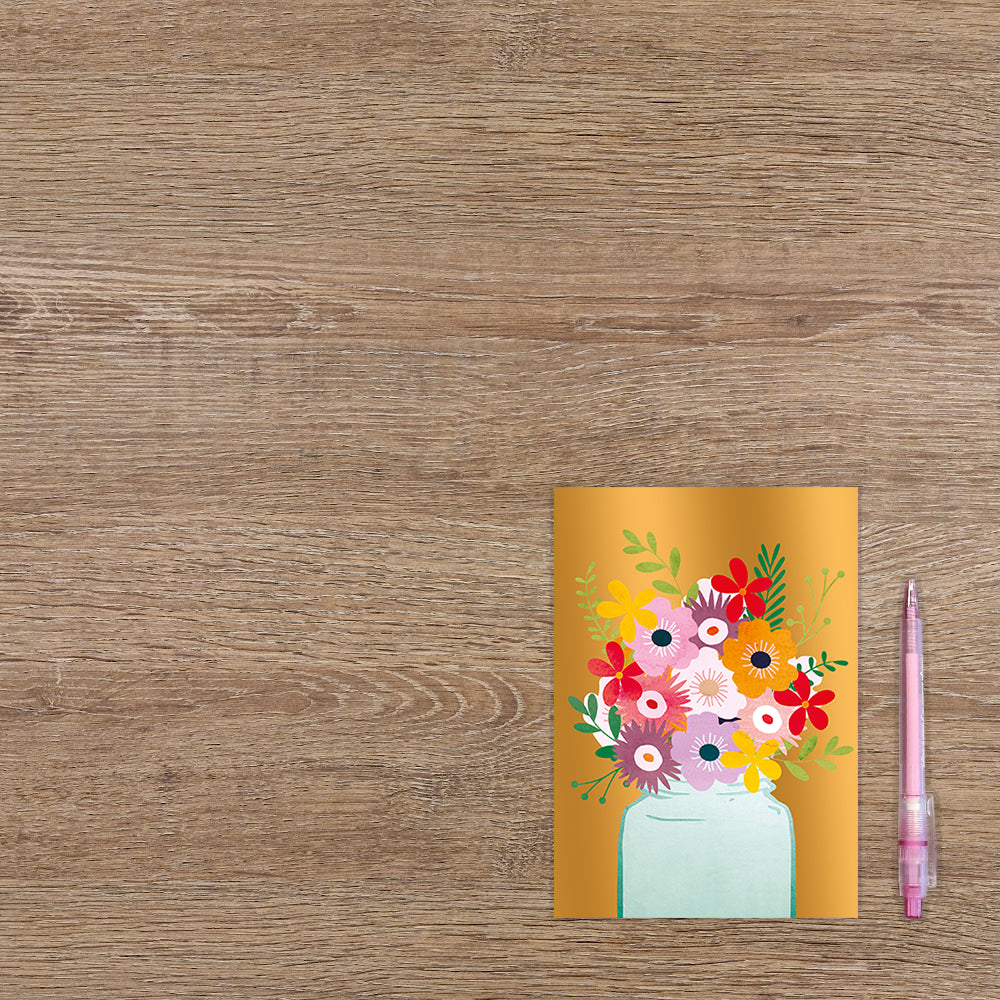 De wenskaart heeft een afmeting van x en een staande vorm. Op deze wenskaart staat een bloemenvaas met de kleuren groen, blauw, rood, paars, roze, geel, oranje en wit, op een gouden achtergrond. De binnenzijde van de wenskaart is blanco wat voldoende ruimte geeft om een persoonlijke boodschap te schrijven .