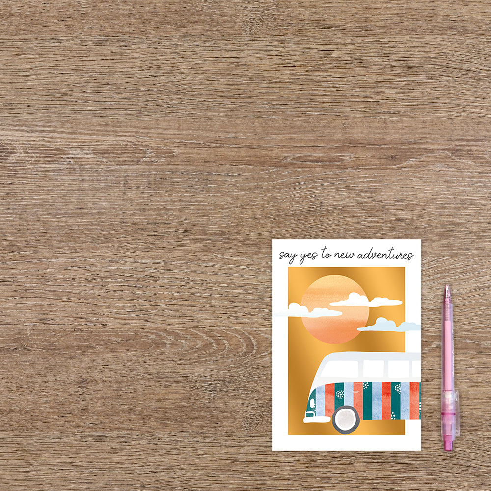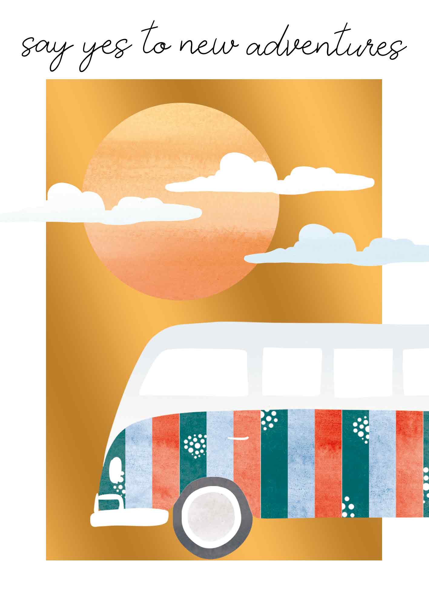 De wenskaart heeft een afmeting van x en een staande vorm. Op deze wenskaart staat een volkswagenbusje in de kleuren rood, blauw, groen en wit met daarboven een zon met wolken, op een gouden achtergrond. Daarboven staat de tekst: "Say yes to new adventures". De binnenzijde van de wenskaart is blanco wat voldoende ruimte geeft om een persoonlijke boodschap te schrijven .