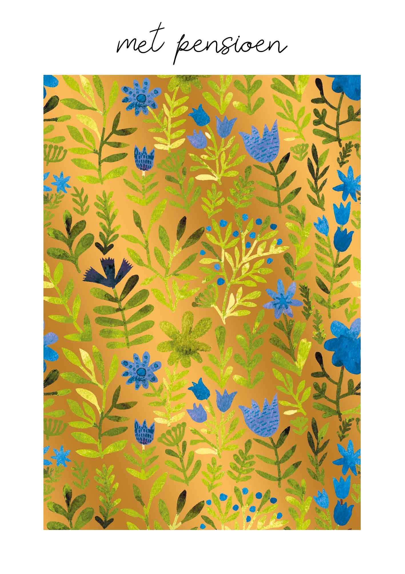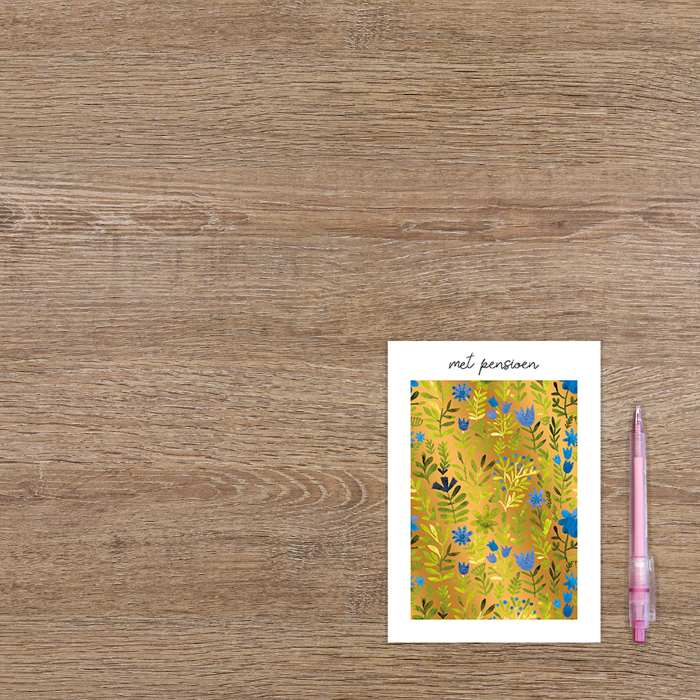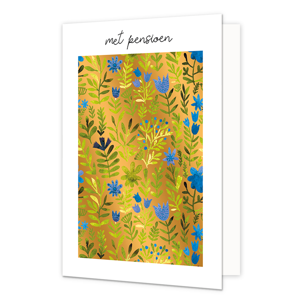 De wenskaart heeft een afmeting van x en een staande vorm. Op deze wenskaart staan groene takken en blaadjes met blauwe bloemen, op een gouden achtergrond. Boven de illustratie staat de tekst: "Met pensioen". De binnenzijde van de wenskaart is blanco wat voldoende ruimte geeft om een persoonlijke boodschap te schrijven .