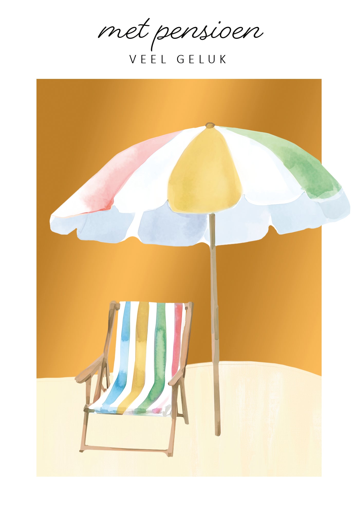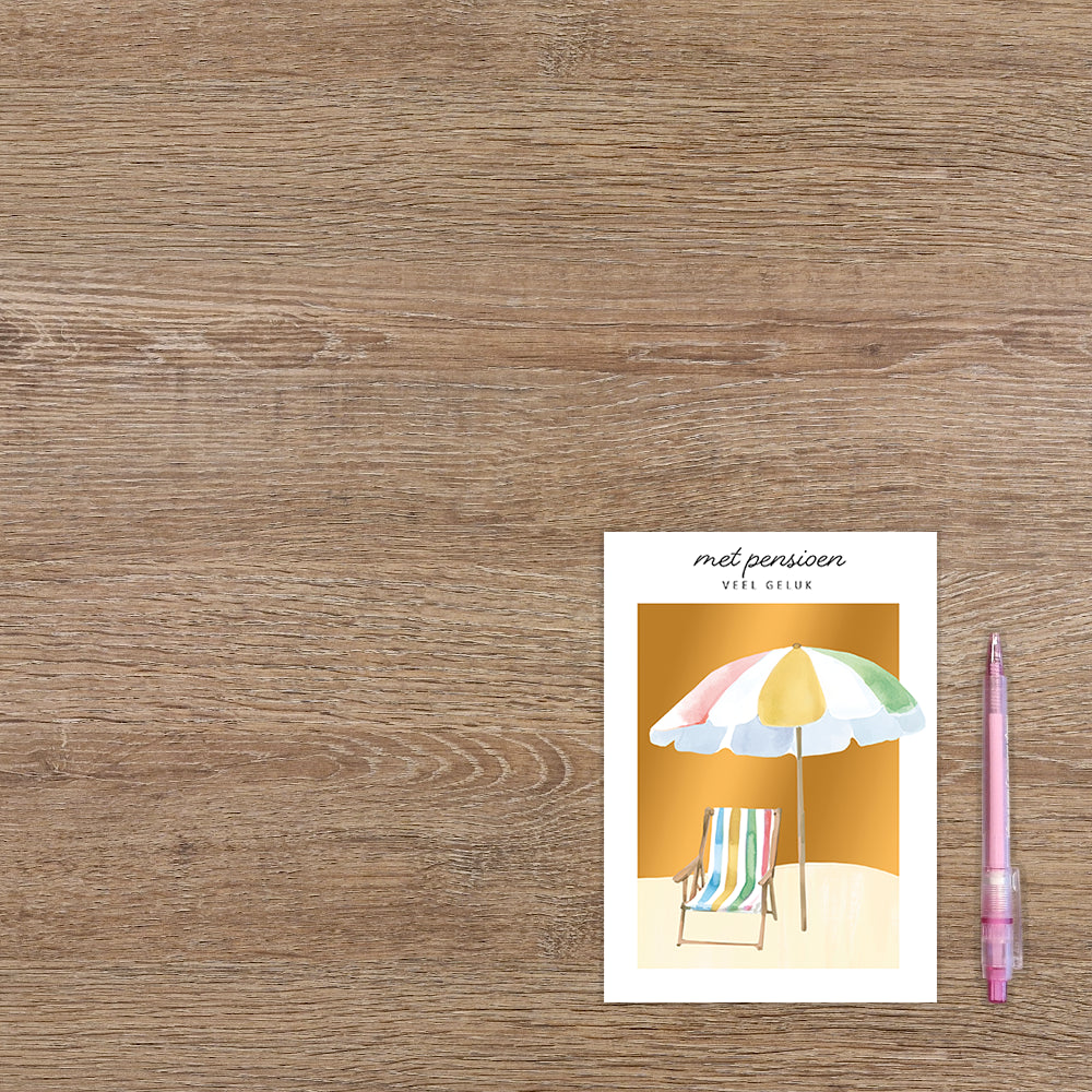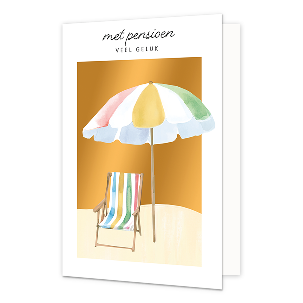 De wenskaart heeft een afmeting van x en een staande vorm. Op deze wenskaart staat een strand met een stranbed en parasol. Daarboven staat de tekst: "Met pensioen veel geluk". De binnenzijde van de wenskaart is blanco wat voldoende ruimte geeft om een persoonlijke boodschap te schrijven .