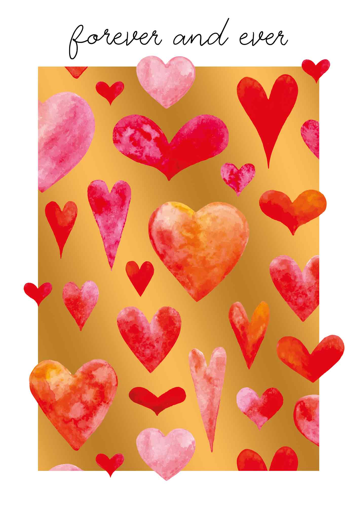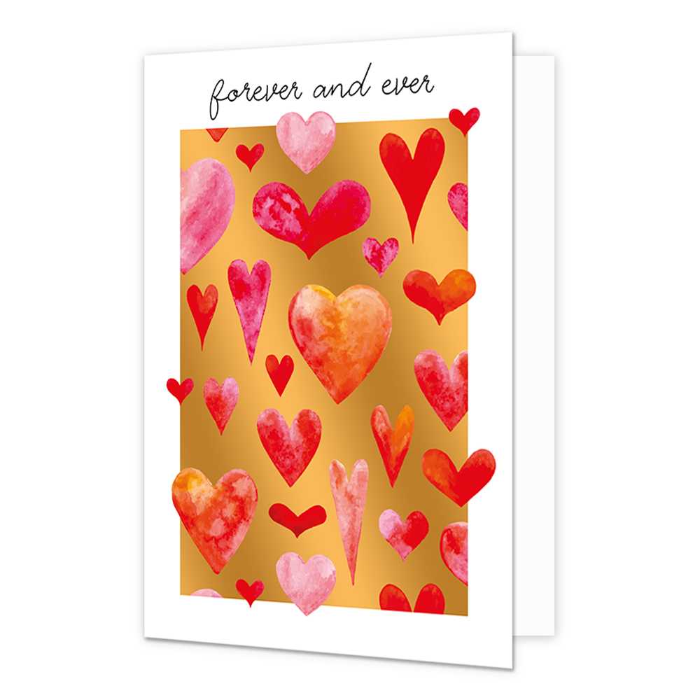 De wenskaart heeft een afmeting van x en een staande vorm. Op deze wenskaart staan hartjes in diverse kleuren rood en roze, op een gouden achtergrond. Boven de illustratie staat de tekst: "Forever and ever". De binnenzijde van de wenskaart is blanco wat voldoende ruimte geeft om een persoonlijke boodschap te schrijven .