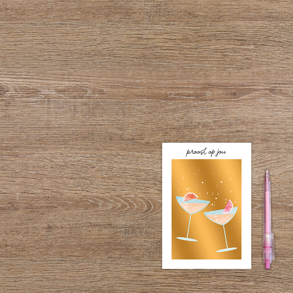 De wenskaart heeft een afmeting van x en een staande vorm. Op deze wenskaart staan ronde champagneglazen met sinaasappelstukjes, op een gouden achtergrond. Boven de illustratie staat de tekst: "Proost op jou". De binnenzijde van de wenskaart is blanco wat voldoende ruimte geeft om een persoonlijke boodschap te schrijven .