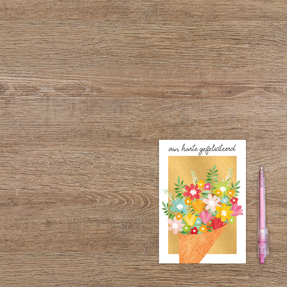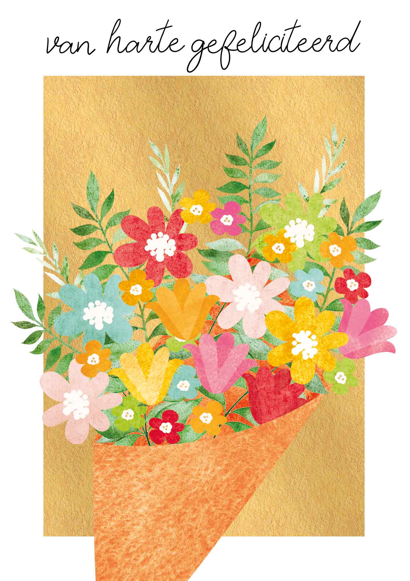 De wenskaart heeft een afmeting van x en een staande vorm. Op deze wenskaart staat een bos bloemen in de kleuren geel, roze, rood, groen en blauw, op een gouden achtergrond. Boven de illustratie staat de tekst: "Van harte gefeliciteerd". De binnenzijde van de wenskaart is blanco wat voldoende ruimte geeft om een persoonlijke boodschap te schrijven .