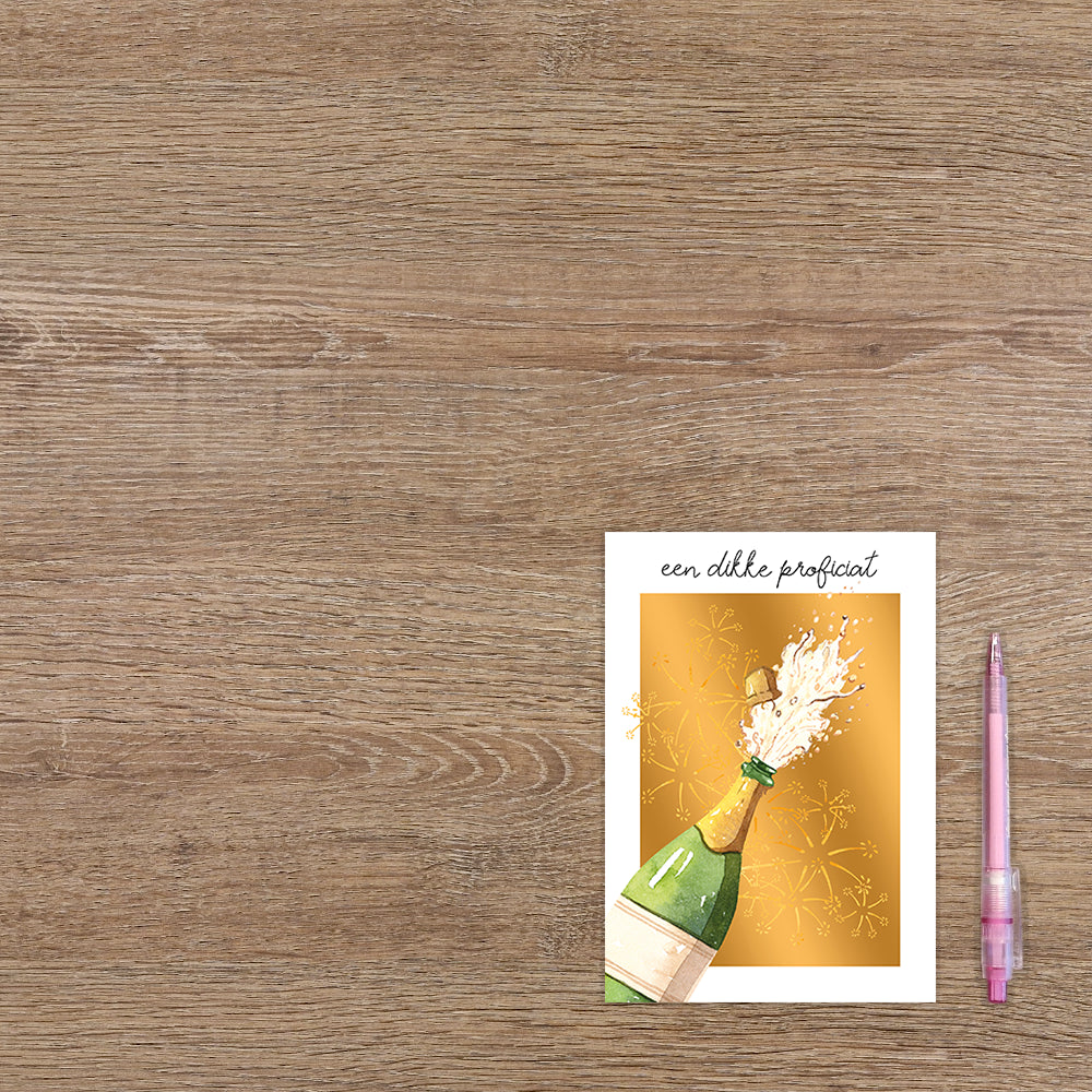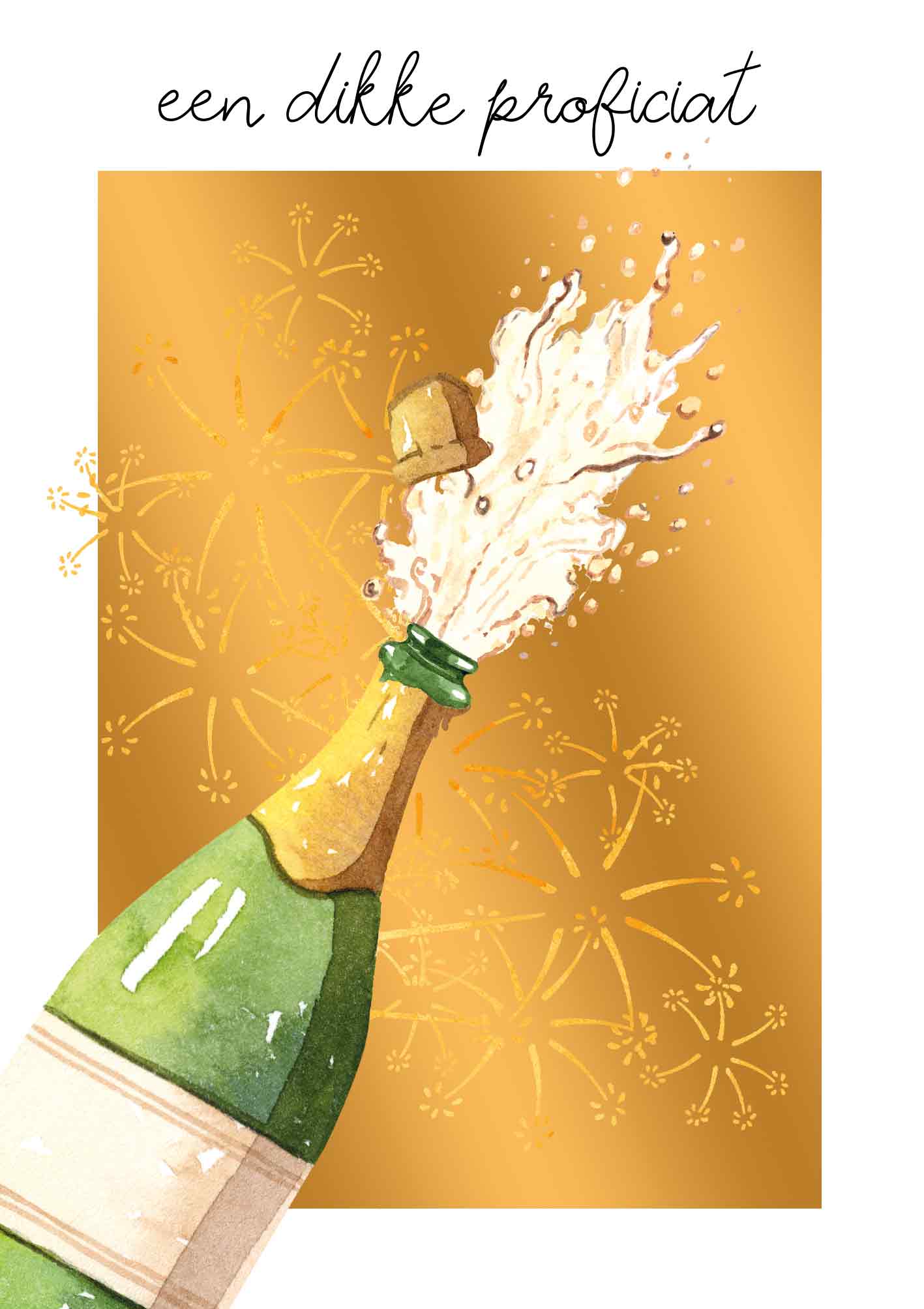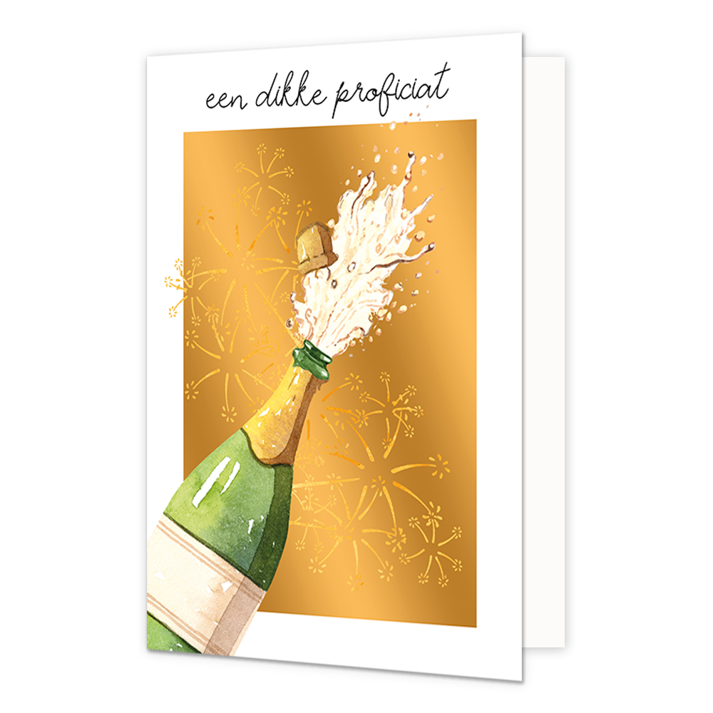 De wenskaart heeft een afmeting van x en een staande vorm. Op deze wenskaart staat een champagnefles op een gouden achtergrond. Boven de illustratie staat de tekst: "Een dikke proficiat". De binnenzijde van de wenskaart is blanco wat voldoende ruimte geeft om een persoonlijke boodschap te schrijven .