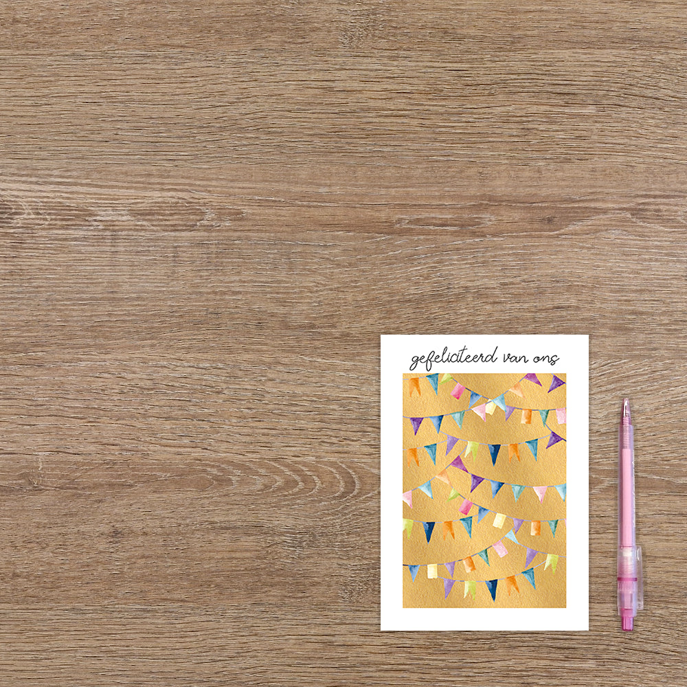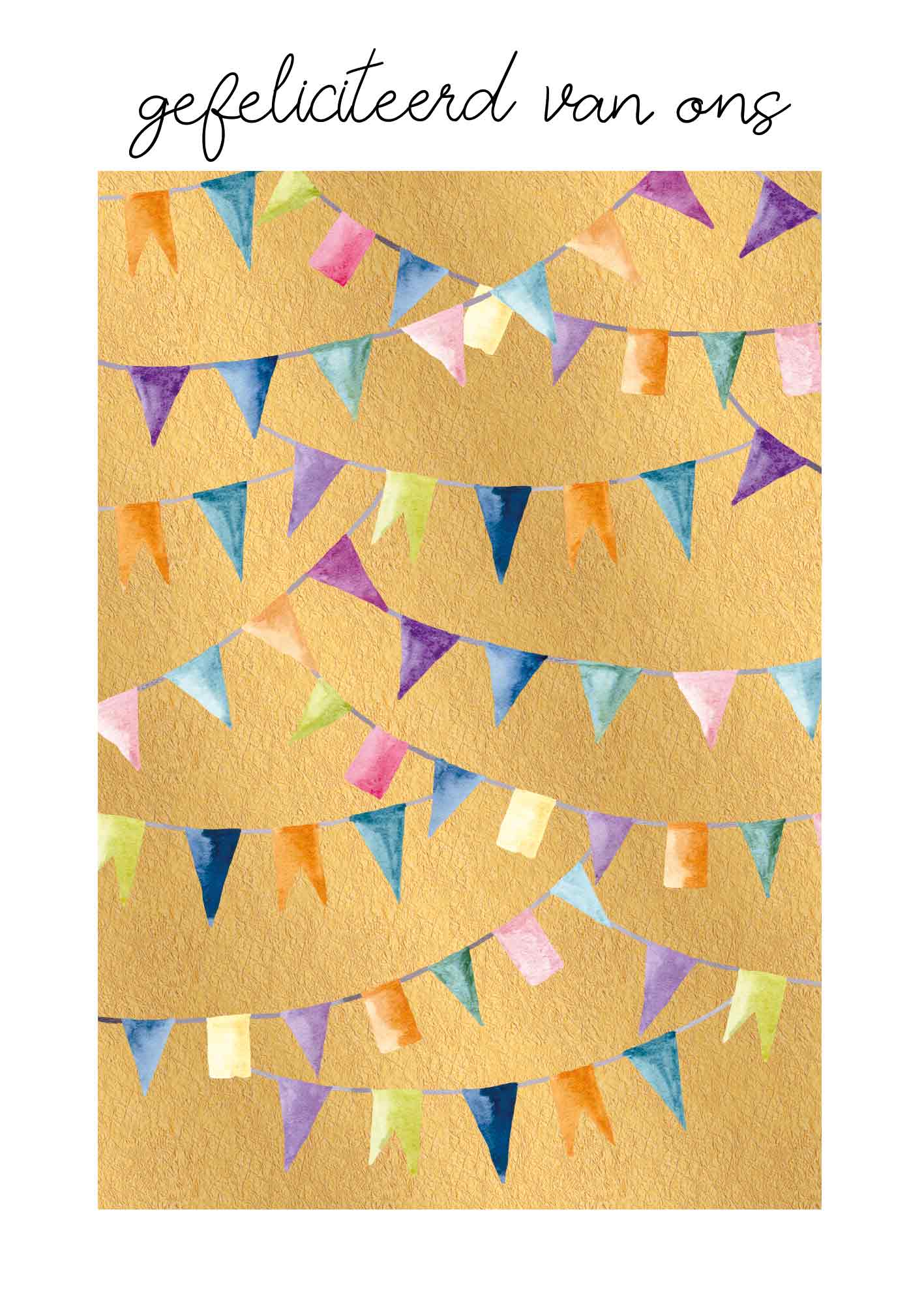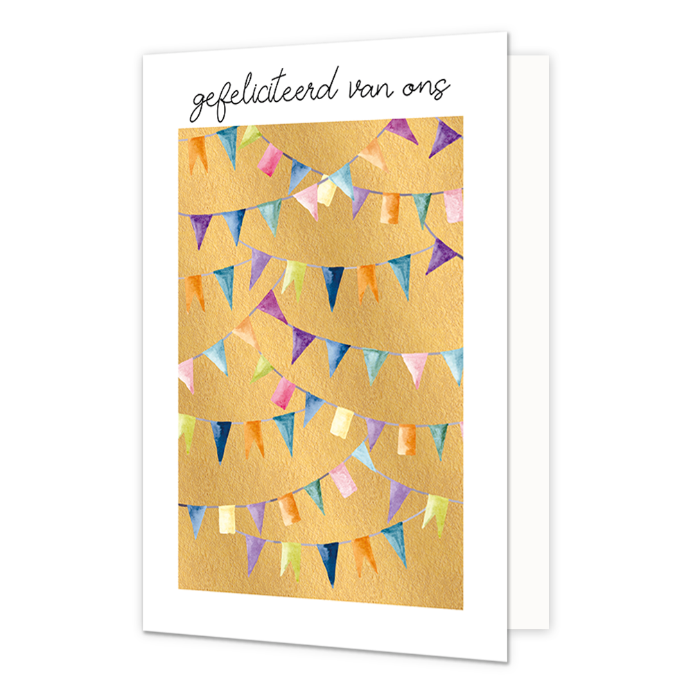 De wenskaart heeft een afmeting van x en een staande vorm. Op deze wenskaart staan slingers in de kleuren paars, blauw, groen, roze, geel en oranje, op een gouden achtergrond. Boven de illustratie staat de tekst: "Gefeliciteerd van ons". De binnenzijde van de wenskaart is blanco wat voldoende ruimte geeft om een persoonlijke boodschap te schrijven .