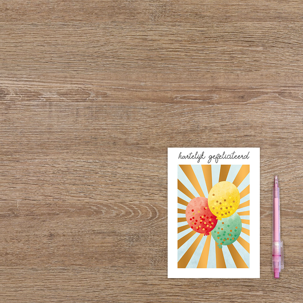 De wenskaart heeft een afmeting van x en een staande vorm. Op deze wenskaart staan drie ballonnen in de kleure geel, rood en groen, met stippen in bijpassende kleuren, op een achtergrond met blauwe en gouden lijnen. Boven de illustratie staat de tekst: "Hartelijk gefeliciteerd". De binnenzijde van de wenskaart is blanco wat voldoende ruimte geeft om een persoonlijke boodschap te schrijven .