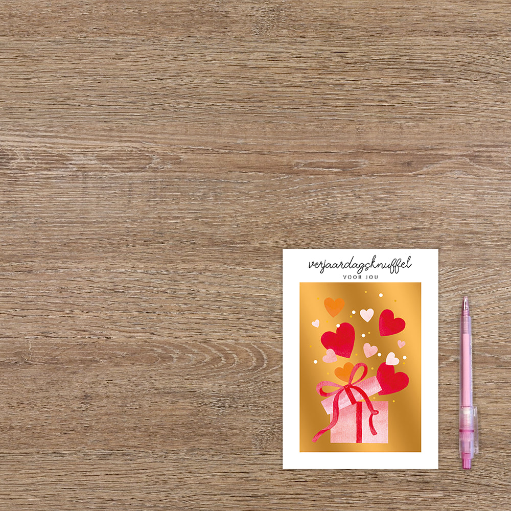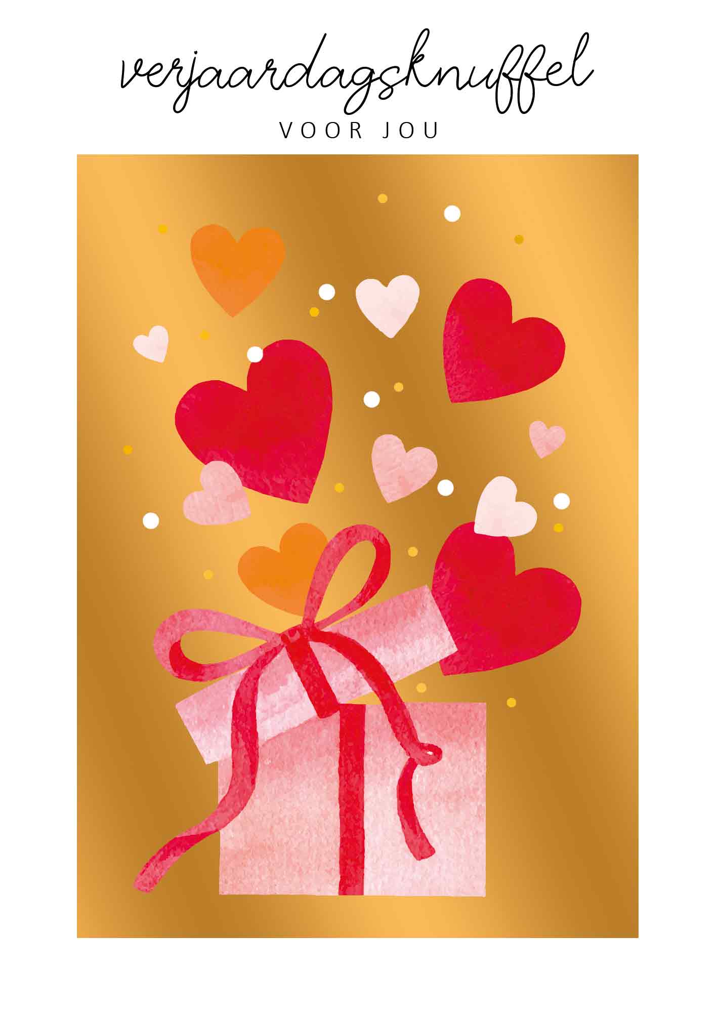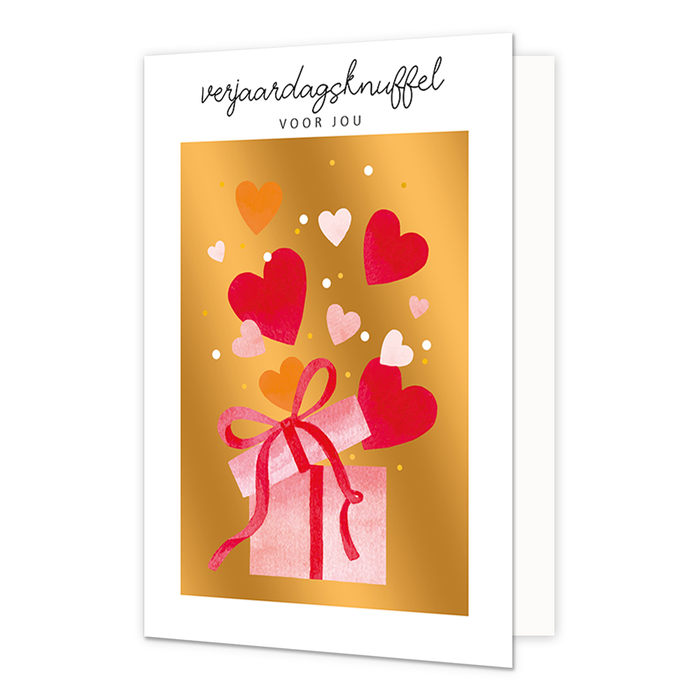 De wenskaart heeft een afmeting van x en een staande vorm. Op deze wenskaart staan hartjes die uit een cadeau komen, op een gouden achtergrond. Boven de illustratie staat de tekst: "Verjaardagsknuffel voor jou". De binnenzijde van de wenskaart is blanco wat voldoende ruimte geeft om een persoonlijke boodschap te schrijven .