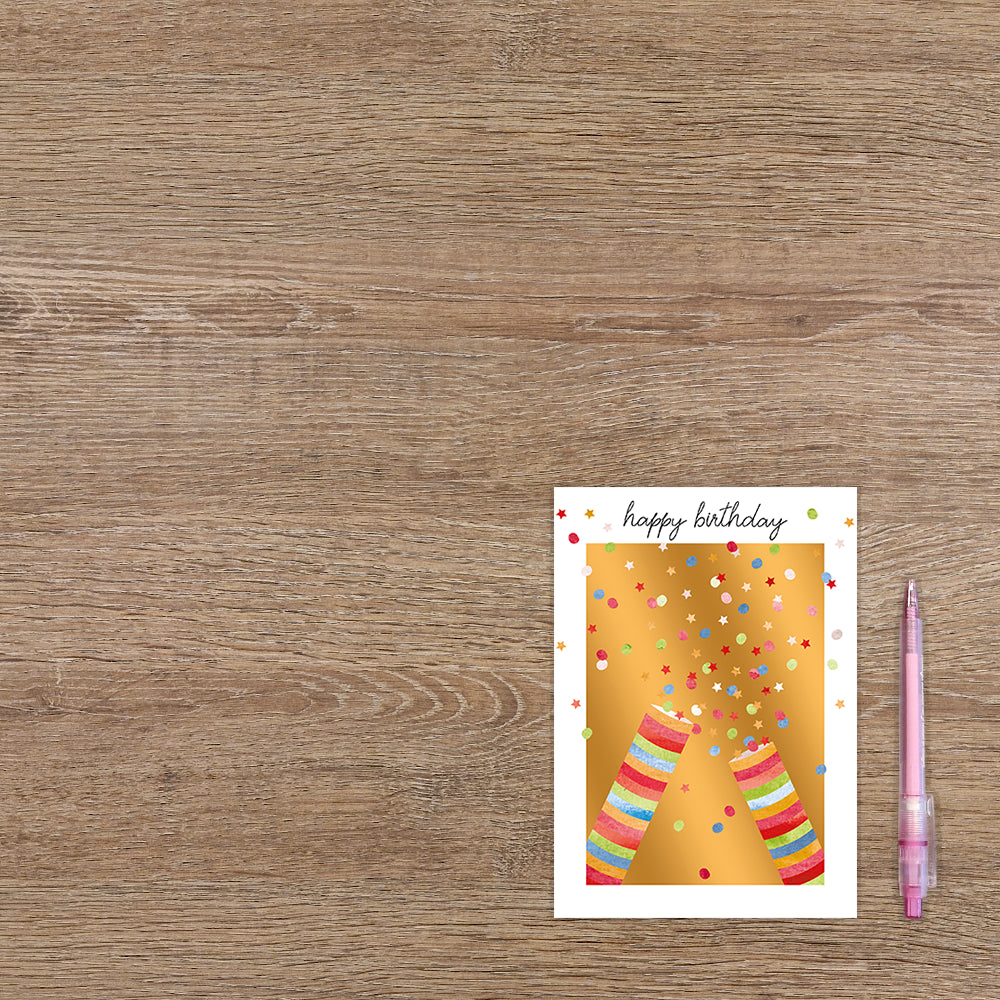 De wenskaart heeft een afmeting van x en een staande vorm. Op deze wenskaart staan twee confetti kanonnen waar sterren en stippen uit komen in de kleuren groen, blauw, rood, roze en wit. Boven de illustratie staat de tekst: "Happy birthday". De binnenzijde van de wenskaart is blanco wat voldoende ruimte geeft om een persoonlijke boodschap te schrijven .