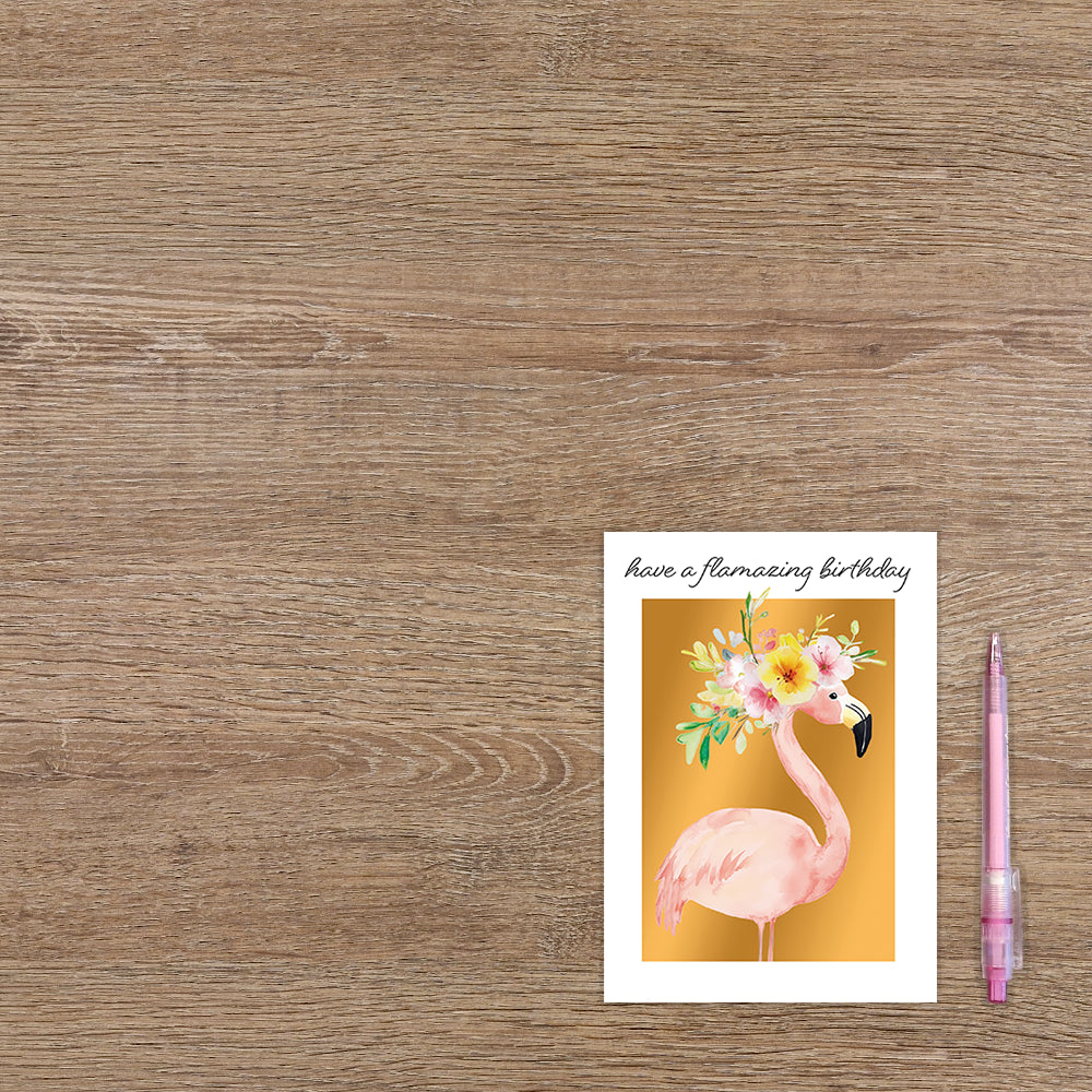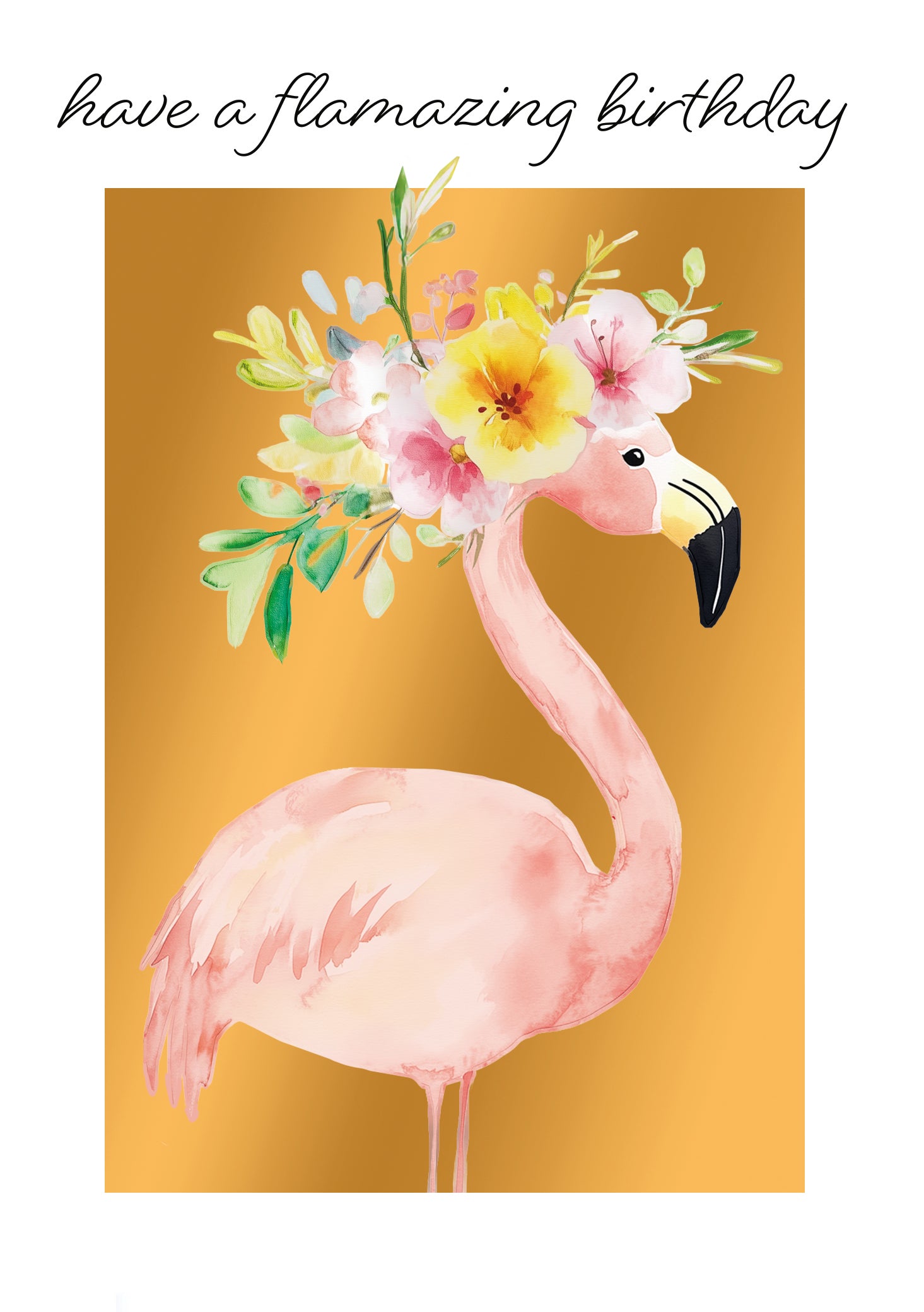De wenskaart heeft een afmeting van x en een staande vorm. Op deze wenskaart staat een flamingo met bloemen op het hoofd en daarboven de tekst: "Have a flamazing birthday". De binnenzijde van de wenskaart is blanco wat voldoende ruimte geeft om een persoonlijke boodschap te schrijven .