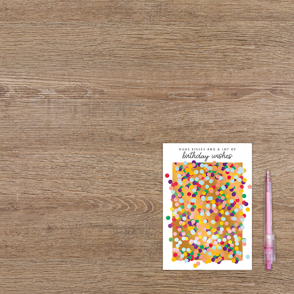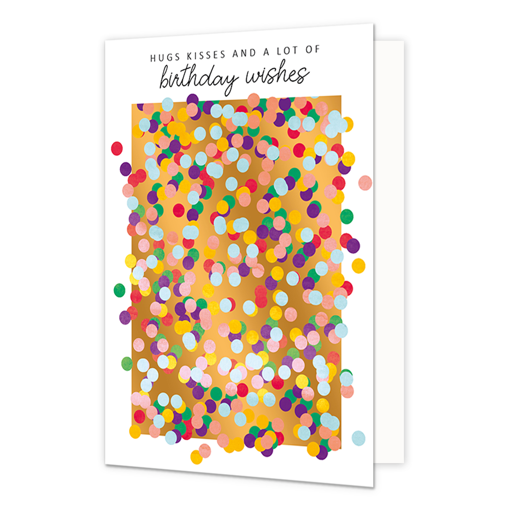 De wenskaart heeft een afmeting van x en een staande vorm. Op deze wenskaart staat confetti in de kleuren roze, paars, groen, blauw en geel, op een gouden achtergrond. Boven de illustratie staat de tekst: "Hugs kisses and a lot of birthday wishes". De binnenzijde van de wenskaart is blanco wat voldoende ruimte geeft om een persoonlijke boodschap te schrijven .
