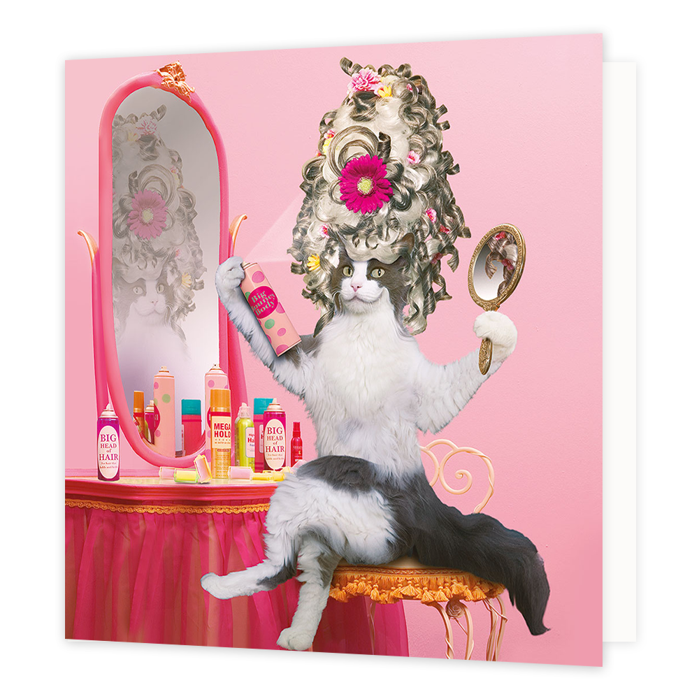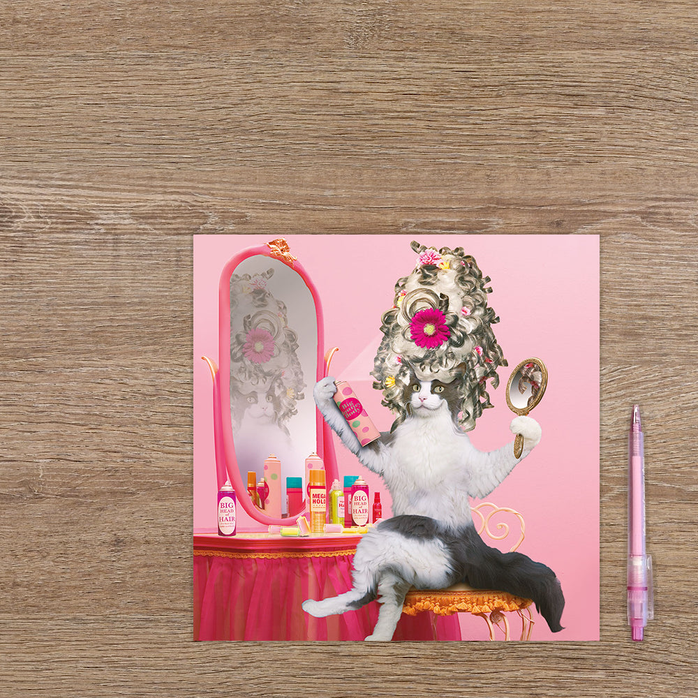 De wenskaart heeft een afmeting van x en een vierkante vorm. Op deze wenskaart staat een kat die op een stoel zit, achter een make-up tafel, die zijn haren aan het doen is. De binnenzijde van de wenskaart is bedrukt met de tekst "Happy birthday".