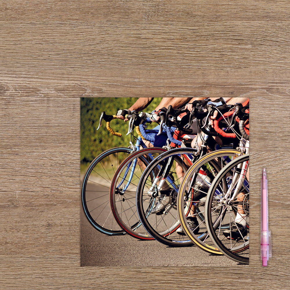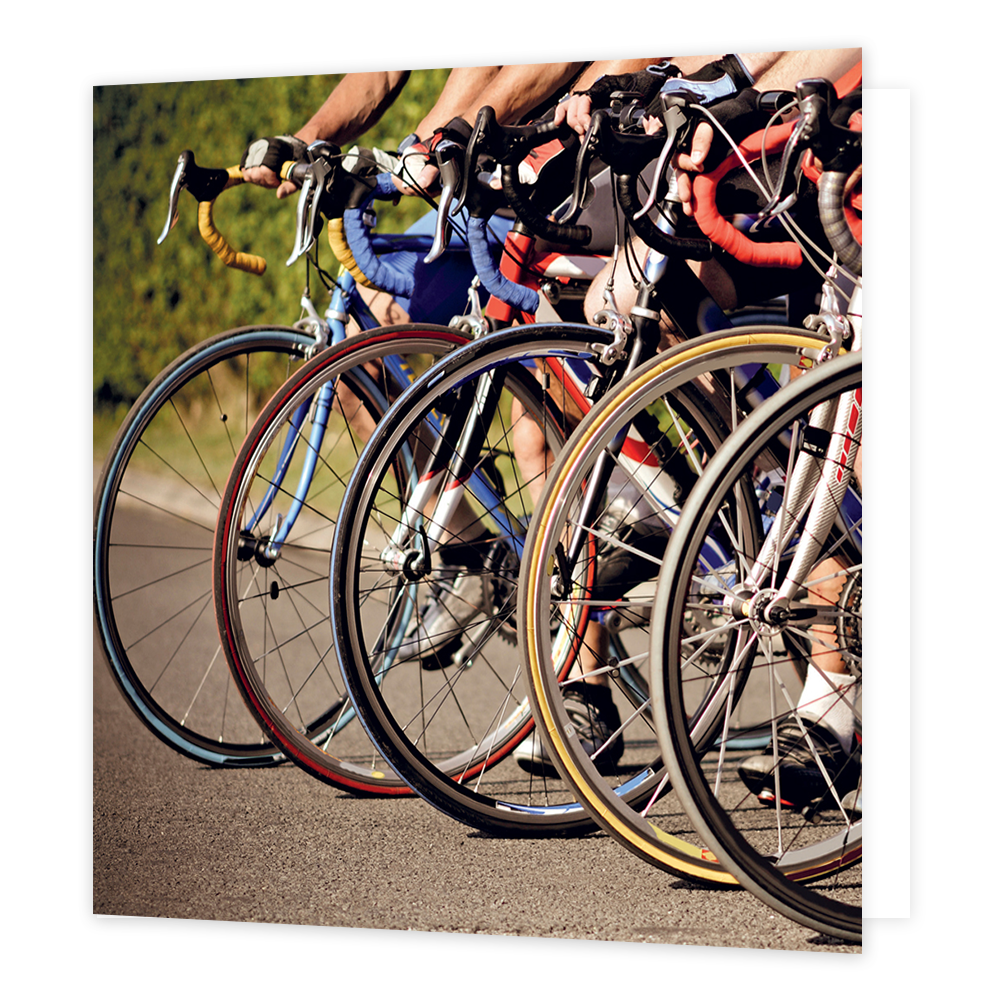 De wenskaart heeft een afmeting van x en een vierkante vorm. Op deze wenskaart staan vijf wielrenfietsen waar mensen op zitten. De binnenzijde van de wenskaart is blanco wat voldoende ruimte geeft om een persoonlijke boodschap te schrijven .