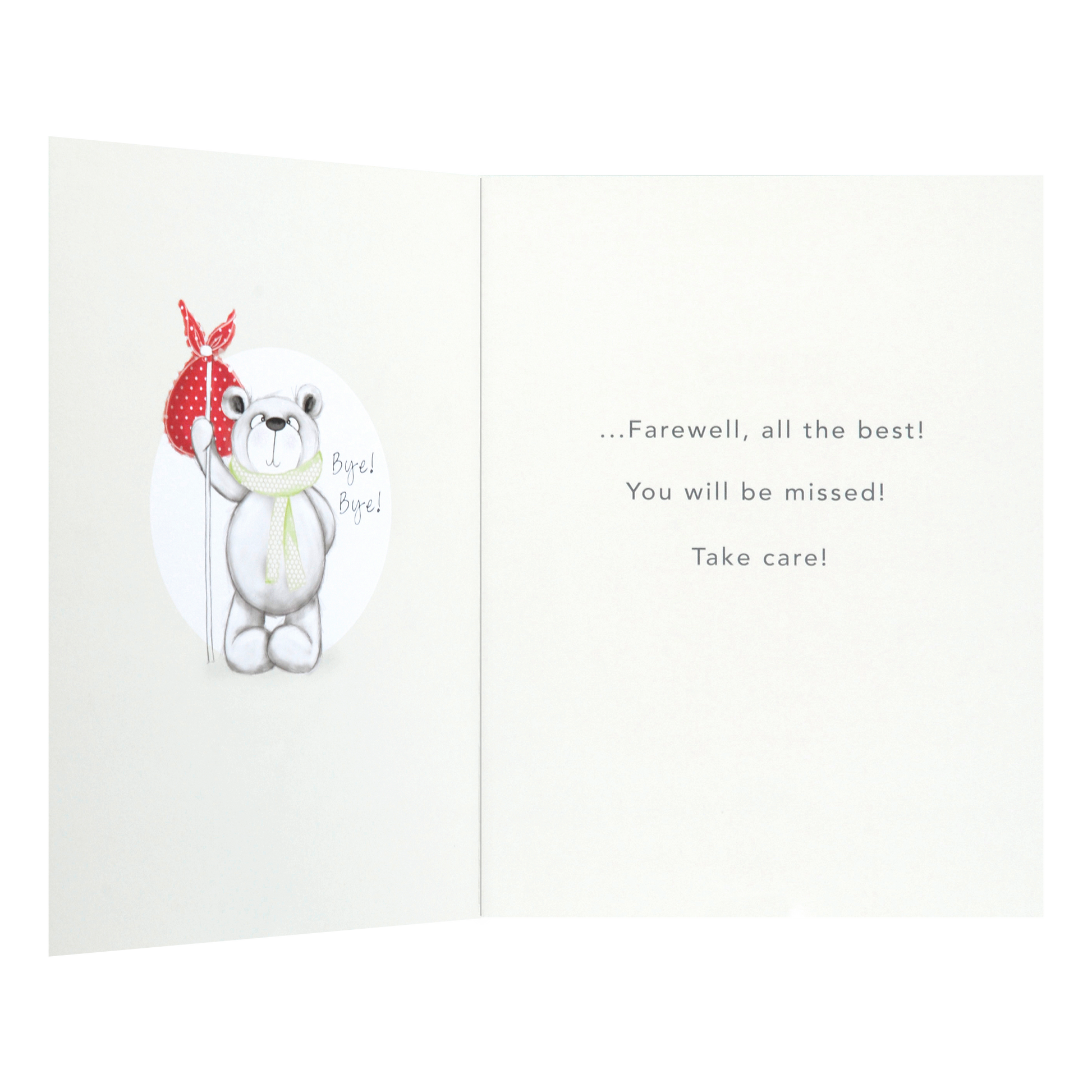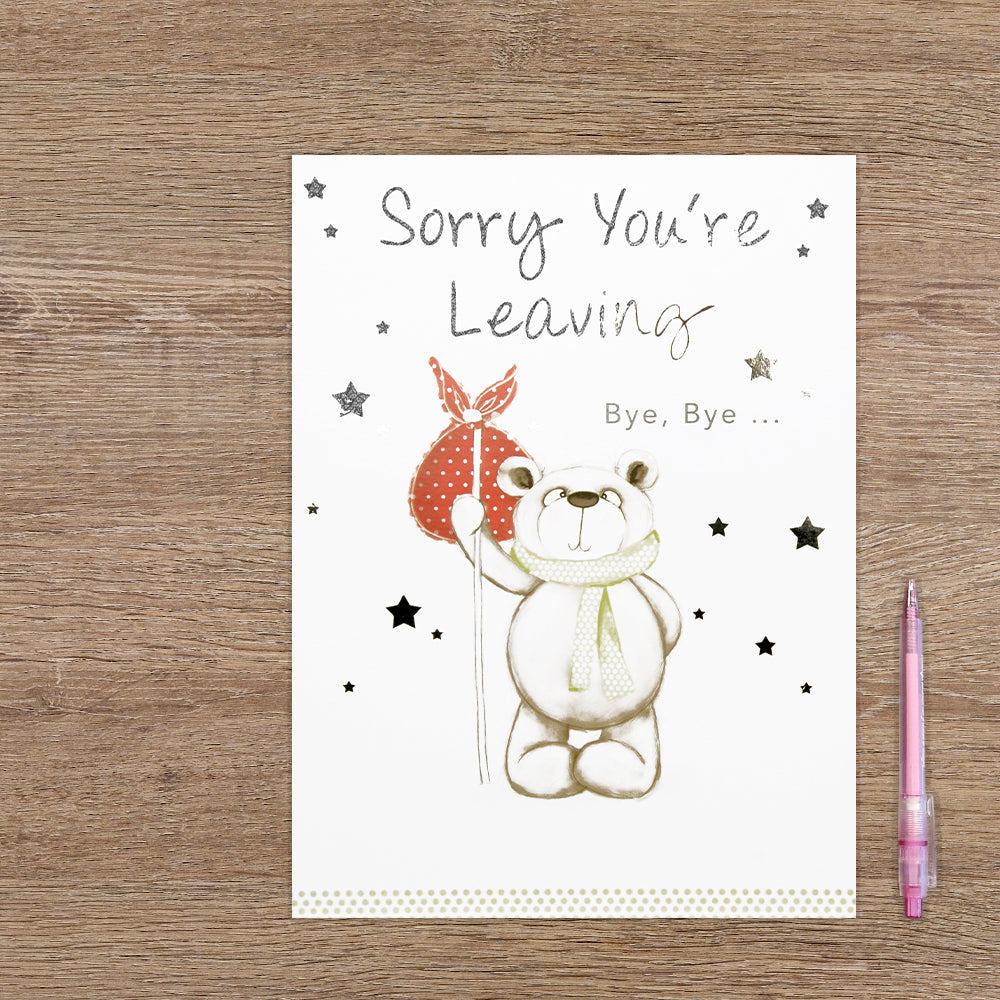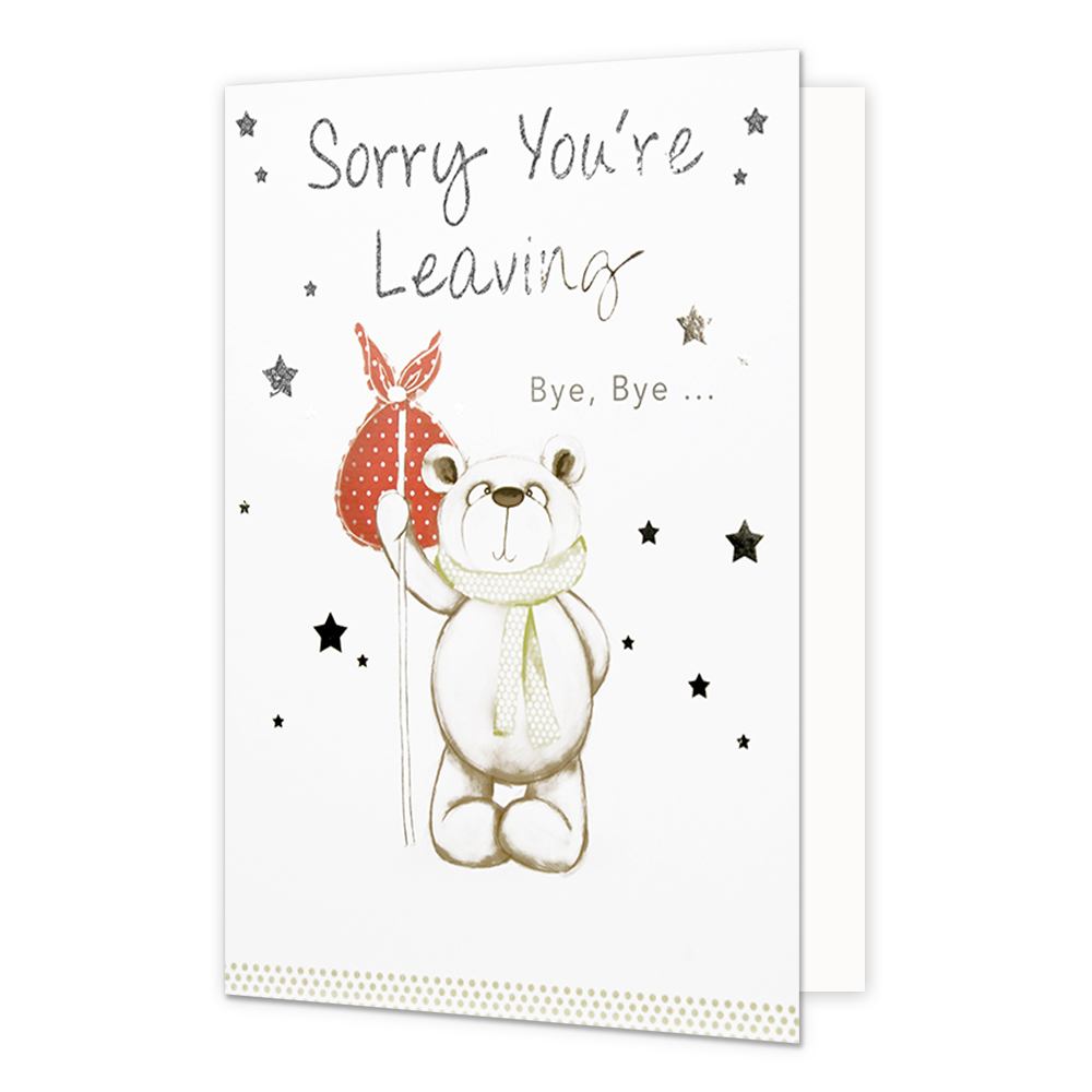 De wenskaart heeft een afmeting van x en een staande vorm. Op deze wenskaart staat een beer die een knapzak vast heeft met daarboven de tekst: "Sorry you're leaving bye, bye". De binnenzijde van de wenskaart is bedrukt met een ontwerp passend bij de voorzijde van de kaart en de tekst "...Farewell, all the best! You will be missed! Take care!"..