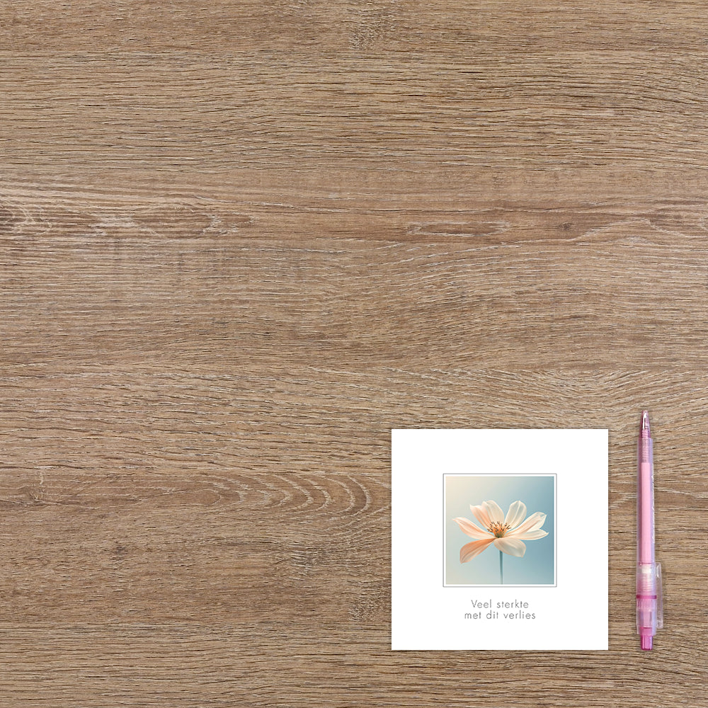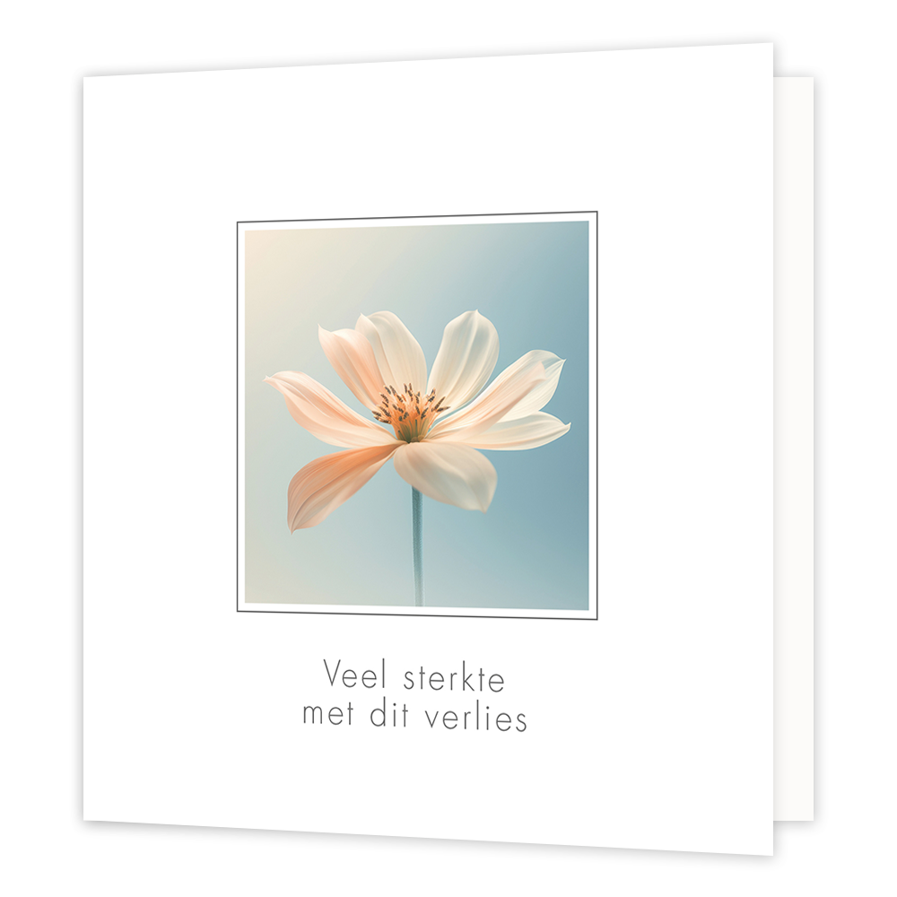 De wenskaart heeft een afmeting van x en een vierkante vorm. Op deze wenskaart staat een witte bloem in een blauw kader. Onder de kader staat de tekst: "Veel sterkte met dit verlies". De binnenzijde van de wenskaart is blanco wat voldoende ruimte geeft om een persoonlijke boodschap te schrijven .