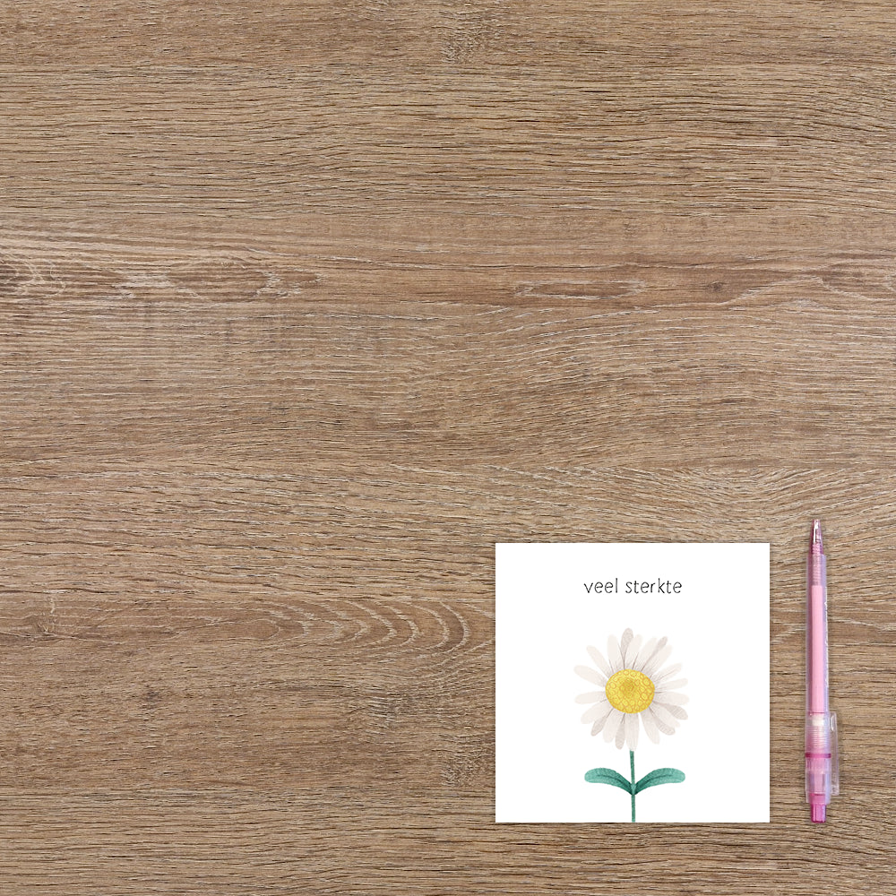 De wenskaart heeft een afmeting van x en een vierkante vorm. Op deze wenskaart staat een witte bloem met daarboven de tekst: "Veel sterkte". De binnenzijde van de wenskaart is blanco wat voldoende ruimte geeft om een persoonlijke boodschap te schrijven .