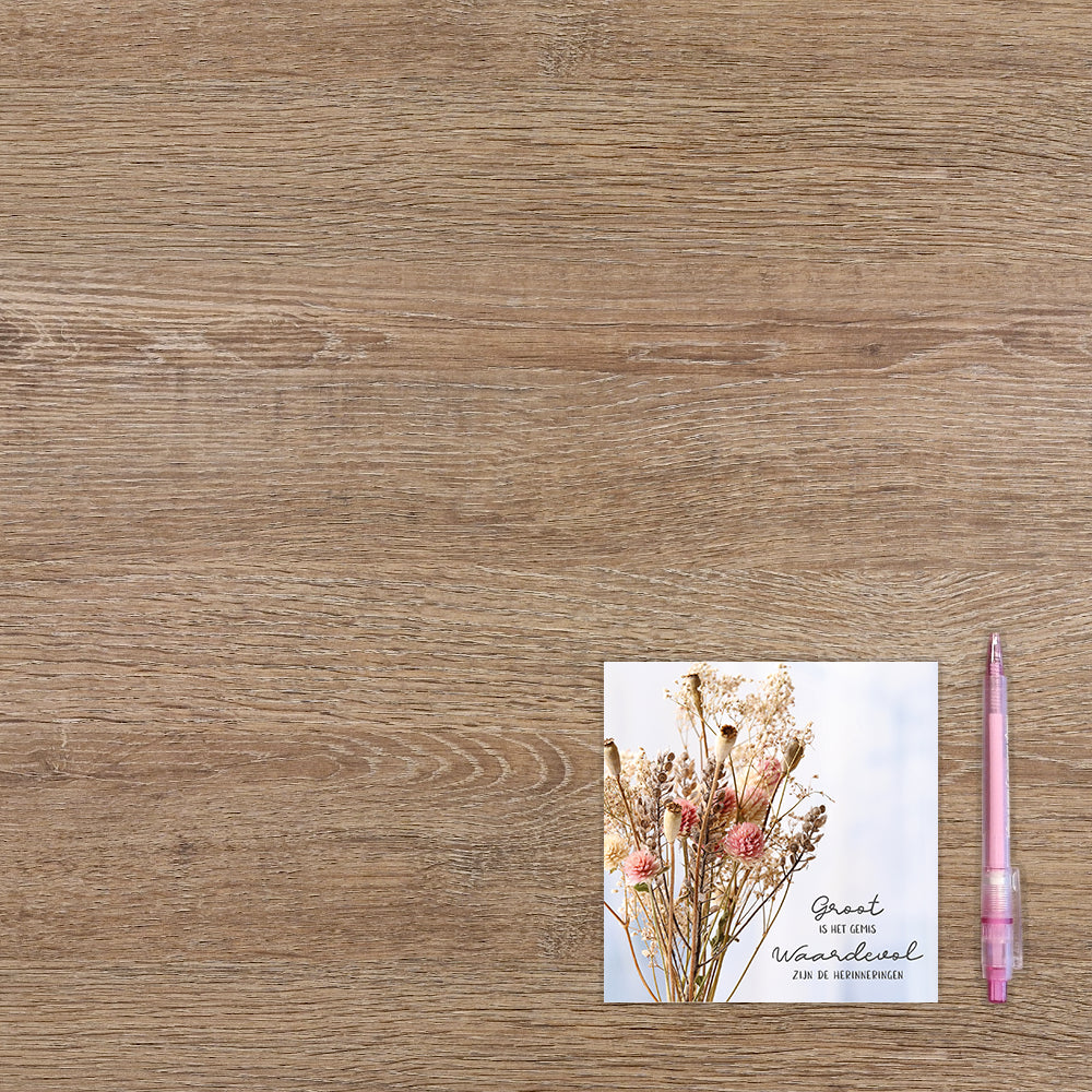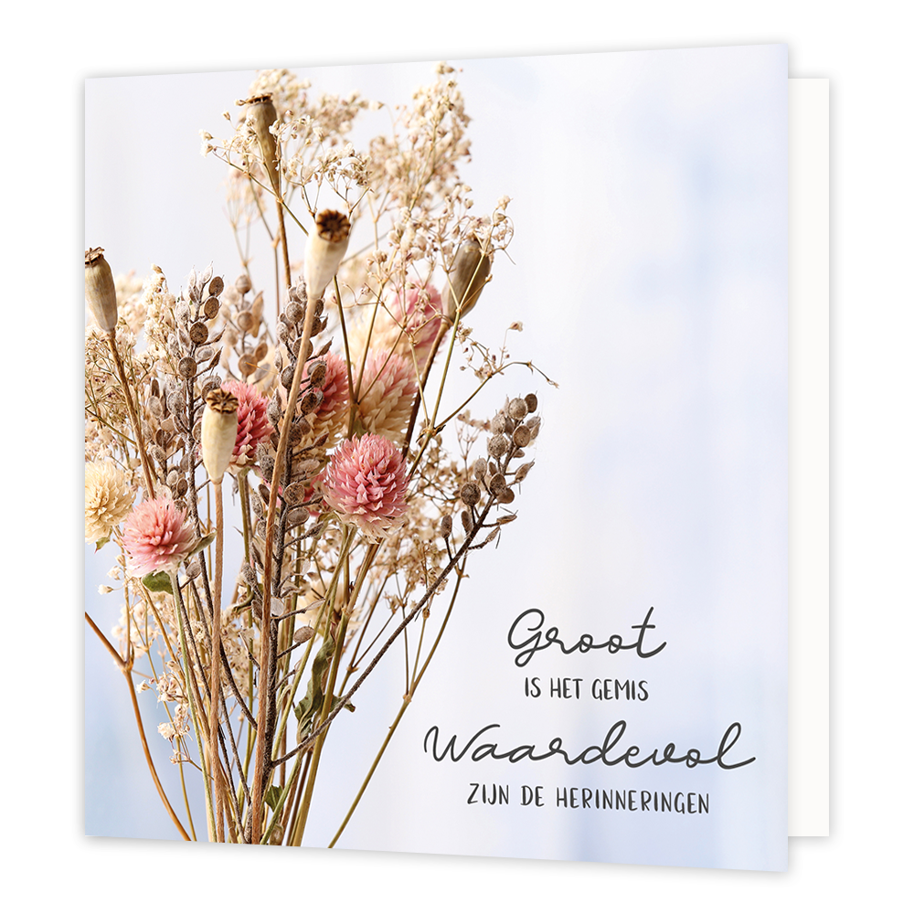 De wenskaart heeft een afmeting van x en een vierkante vorm. Op deze wenskaart staan droogbloemen op een paarse achtergrond. Rechts onderin staat de tekst: "Groot is het gemis waardevol zijn de herinneringen". De binnenzijde van de wenskaart is bedrukt met de tekst "Veel sterkte".
