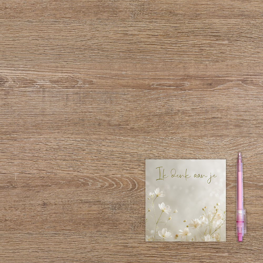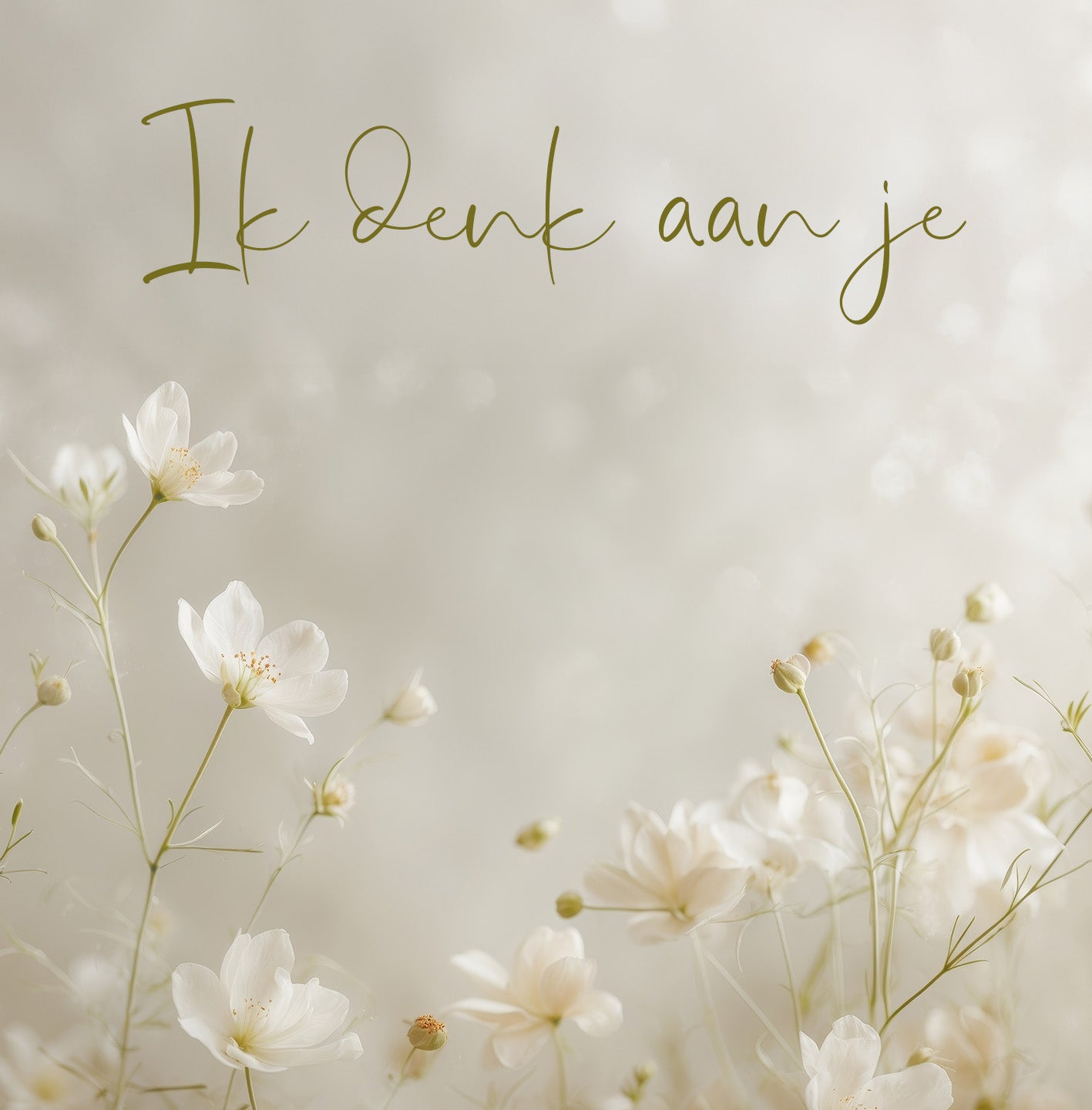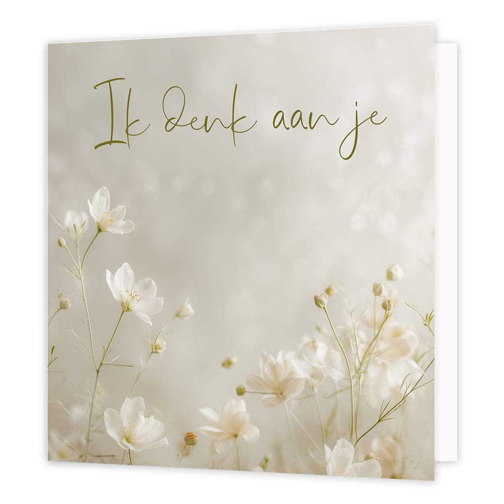 De wenskaart heeft een afmeting van x en een vierkante vorm. Op deze wenskaart staan witte bloemen op een grijze achtergrond met de tekst: "Ik denk aan je". De binnenzijde van de wenskaart is blanco wat voldoende ruimte geeft om een persoonlijke boodschap te schrijven .