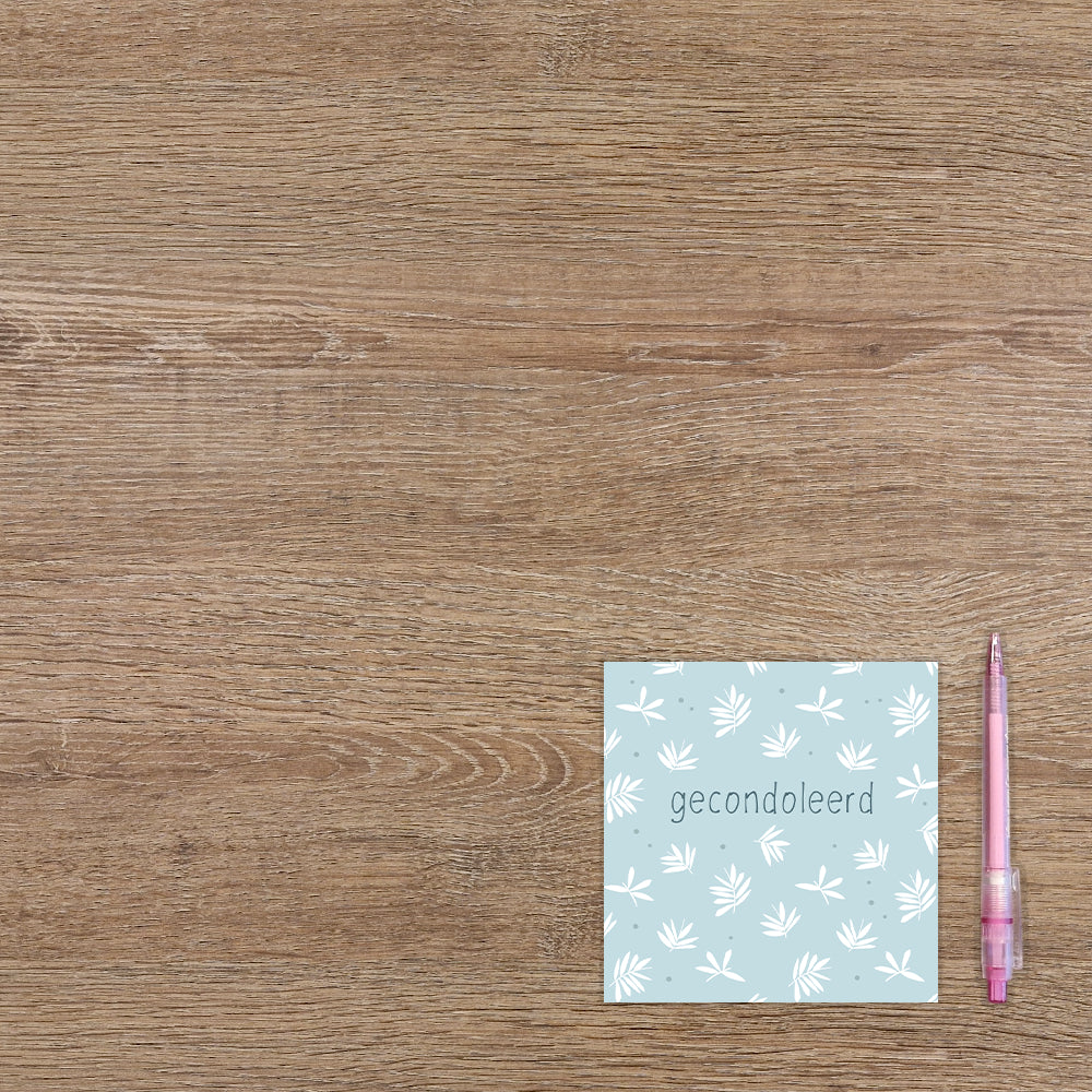 De wenskaart heeft een afmeting van x en een vierkante vorm. Op deze wenskaart staan witte blaadjes op een lichtblauwe achtergrond. In het midden staat de tekst: "Gecondoleerd". De binnenzijde van de wenskaart is bedrukt met de tekst "Veel sterkte gewenst".