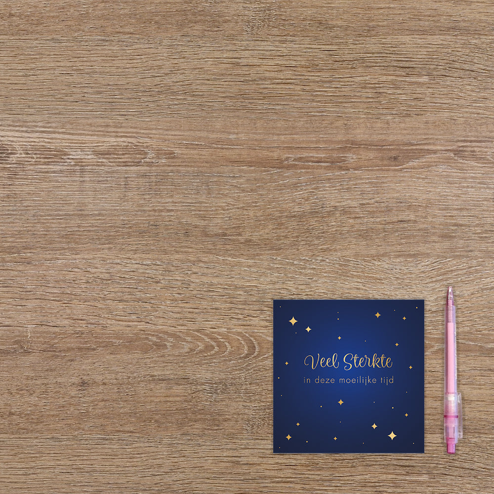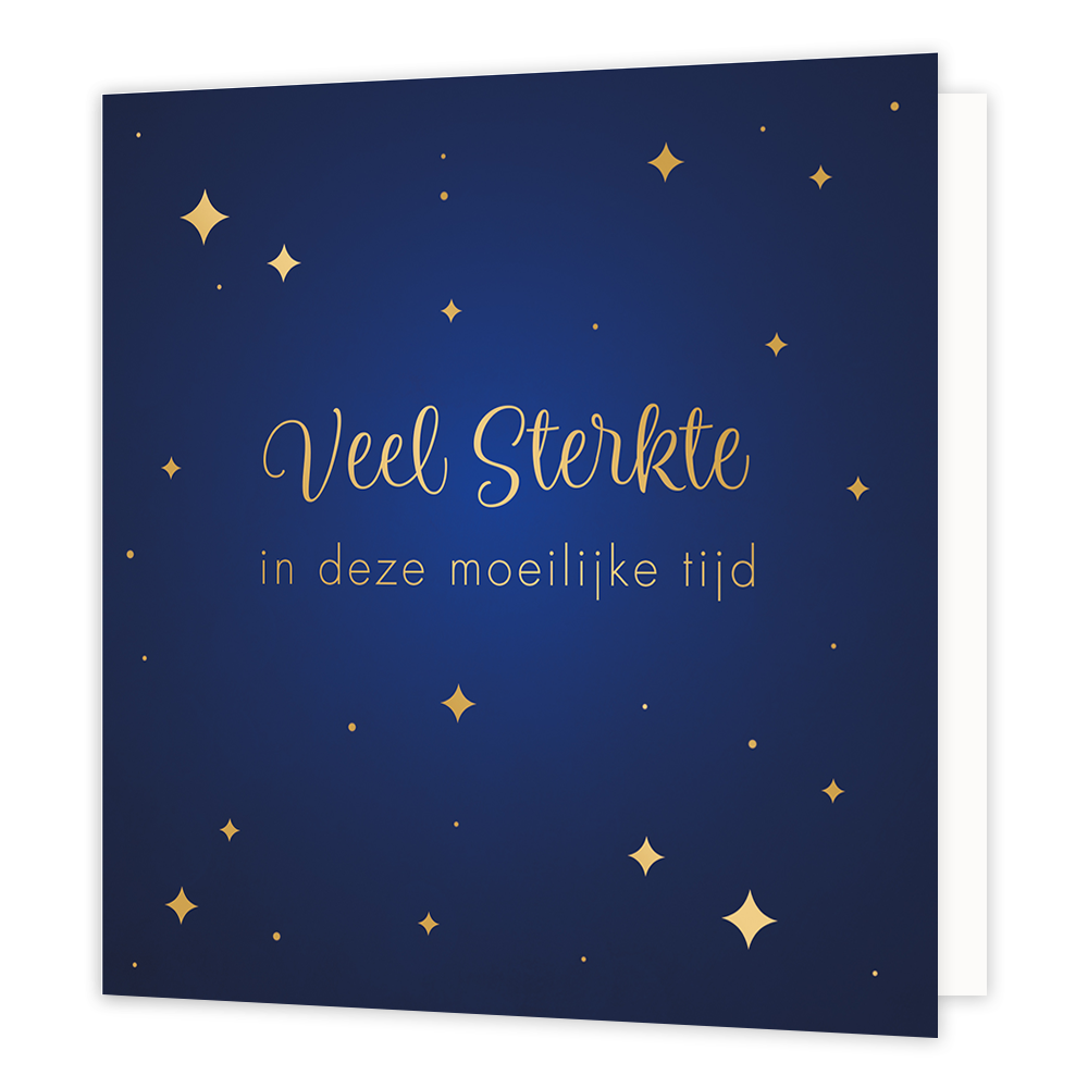 De wenskaart heeft een afmeting van x en een vierkante vorm. Op deze wenskaart zijn gouden sterren te zien op een donkerblauwe achtergrond. In het midden staat de tekst: "Veel sterkte in deze moeilijke tijd". De binnenzijde van de wenskaart is blanco wat voldoende ruimte geeft om een persoonlijke boodschap te schrijven .