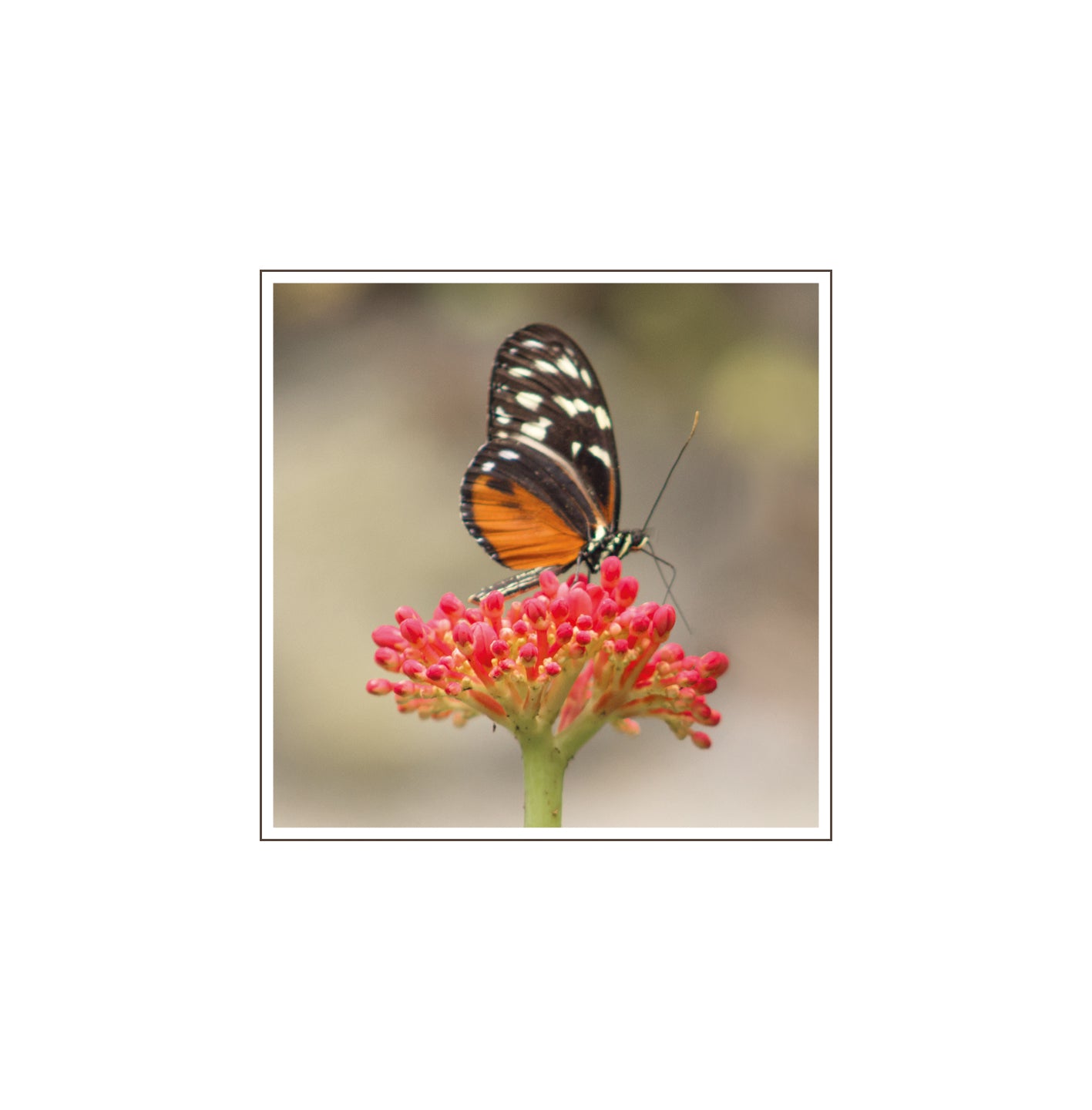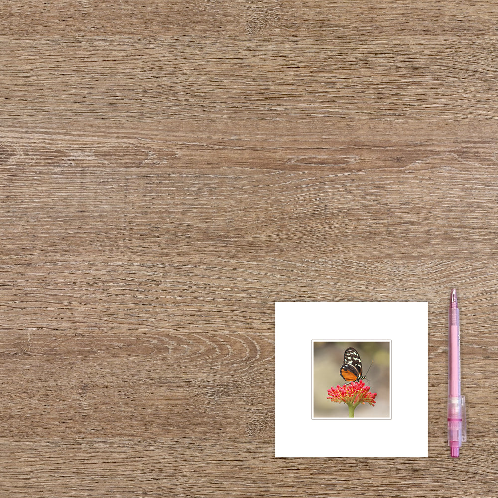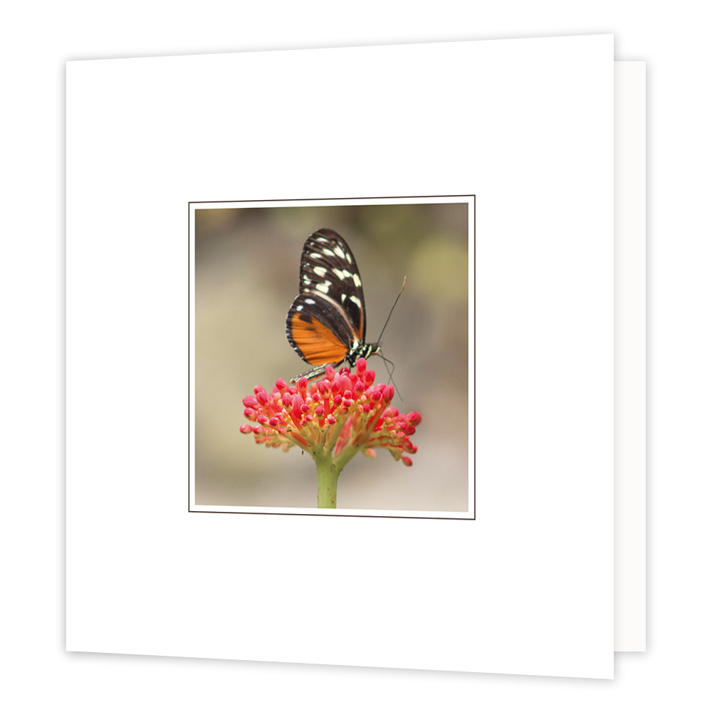 De wenskaart heeft een afmeting van x en een vierkante vorm. Op deze wenskaart staat een rode bloem met daarop een vlinder. De binnenzijde van de wenskaart is bedrukt met de tekst "Veel sterkte".