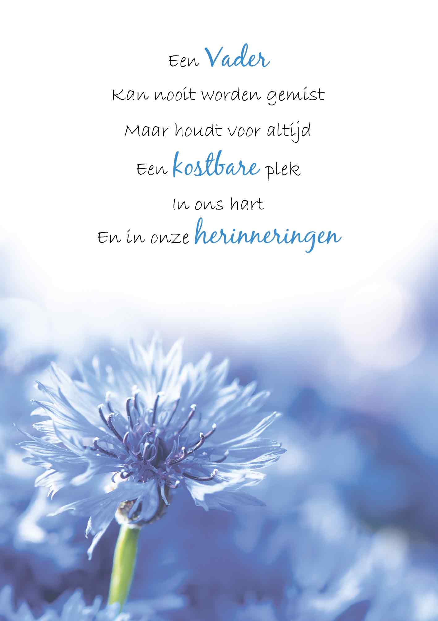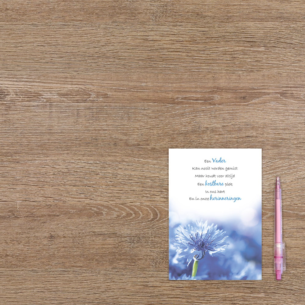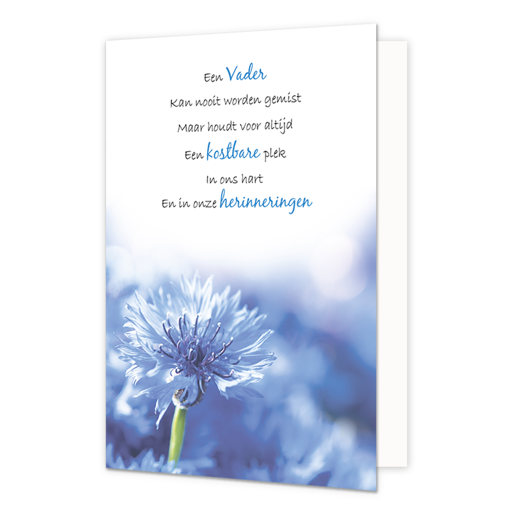 De wenskaart heeft een afmeting van x en een staande vorm. Op deze wenskaart staan blauwe bloemen met daarboven de tekst: "Een vader kan nooit worden gemist maar houdt voor atijd een kostbare plek in ons hart en in onze herinneringen". De binnenzijde van de wenskaart is bedrukt met de tekst "Veel sterkte met dit verlies".